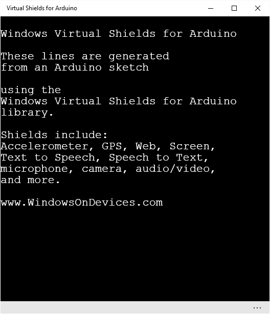 The Virtual Shields for Arduino application enables developers and makers to use a Windows 10 device as a sensor shield for their Arduino board. An Arduino sketch can now make use of any of the sensor and actuator assets of a Windows device - this includes touch screens, cameras, and even speech recognition with Cortana. Connection between the Arduino and Windows device can be established via Bluetooth, USB, or Wi-Fi.