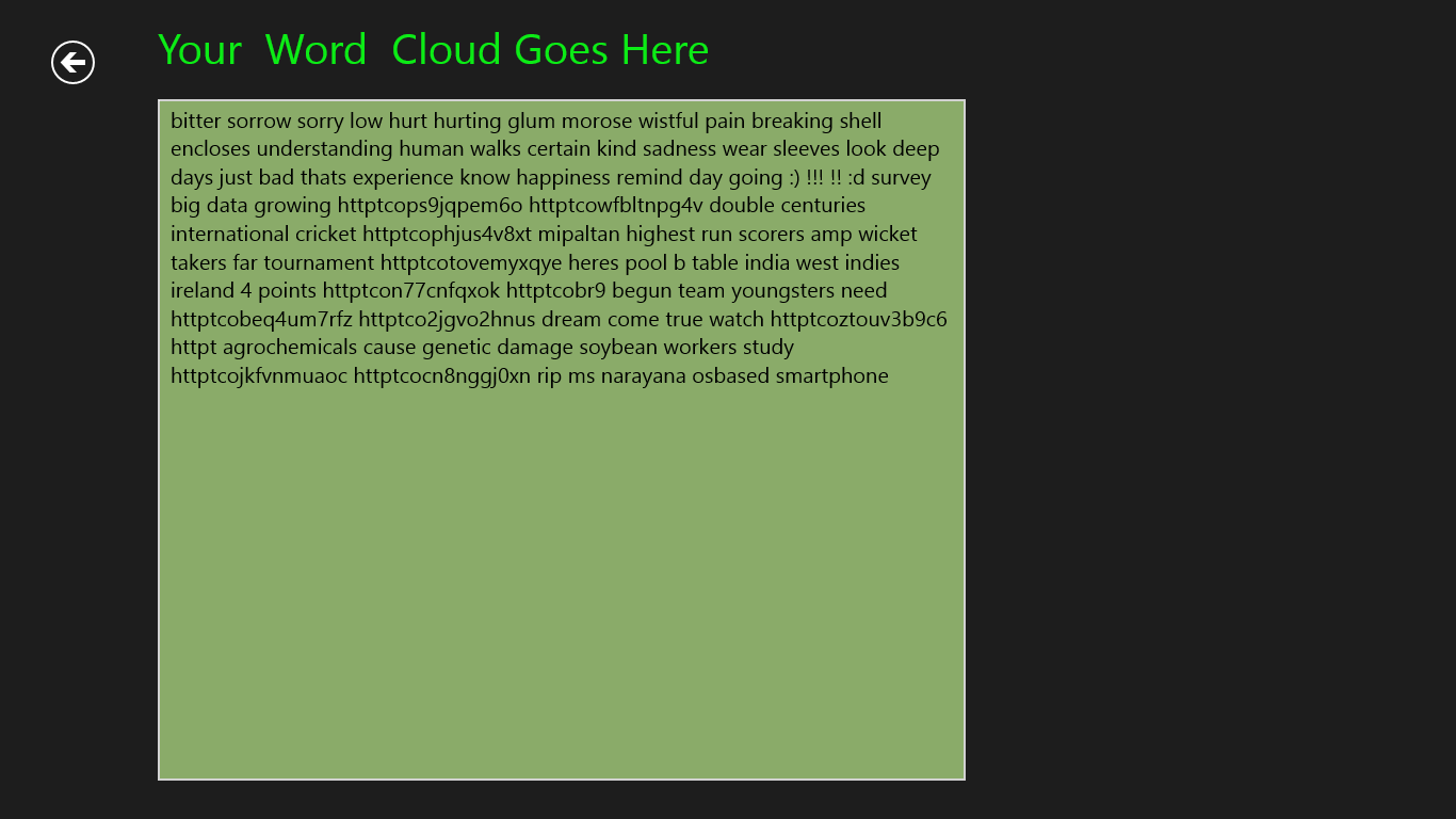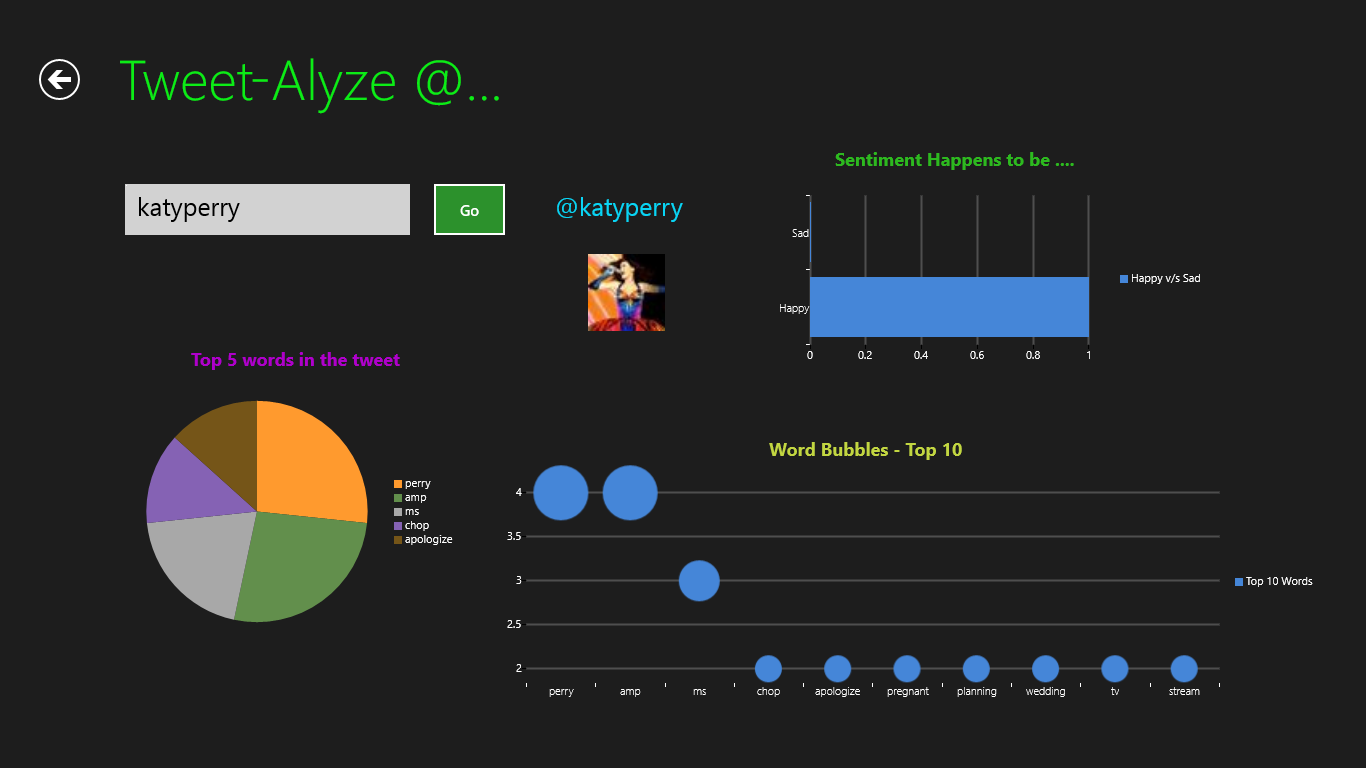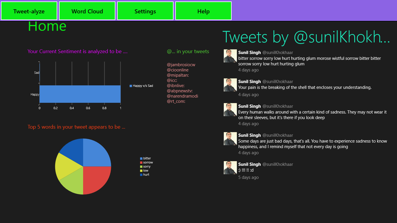 Make your twitter widget as your home screen and get your past max 20 tweets analyzed using the in-built tweets analyzer.Get the tweets analyzed of any twitter account holder by just typing in their screen name. This includes their mood (classified as happy or sad).