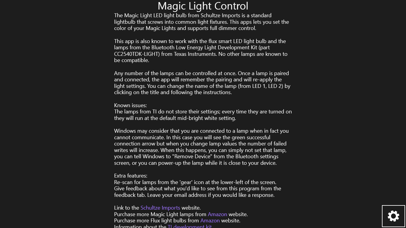 Controls Magic Lamp multicolored Bluetooth-enabled light bulbsLights can be steady, blinking, or flashingAlso Controls flux Smart LED Bluetooth-enabled light bulbs and the TI BLE Lamp kit (CC2540T)