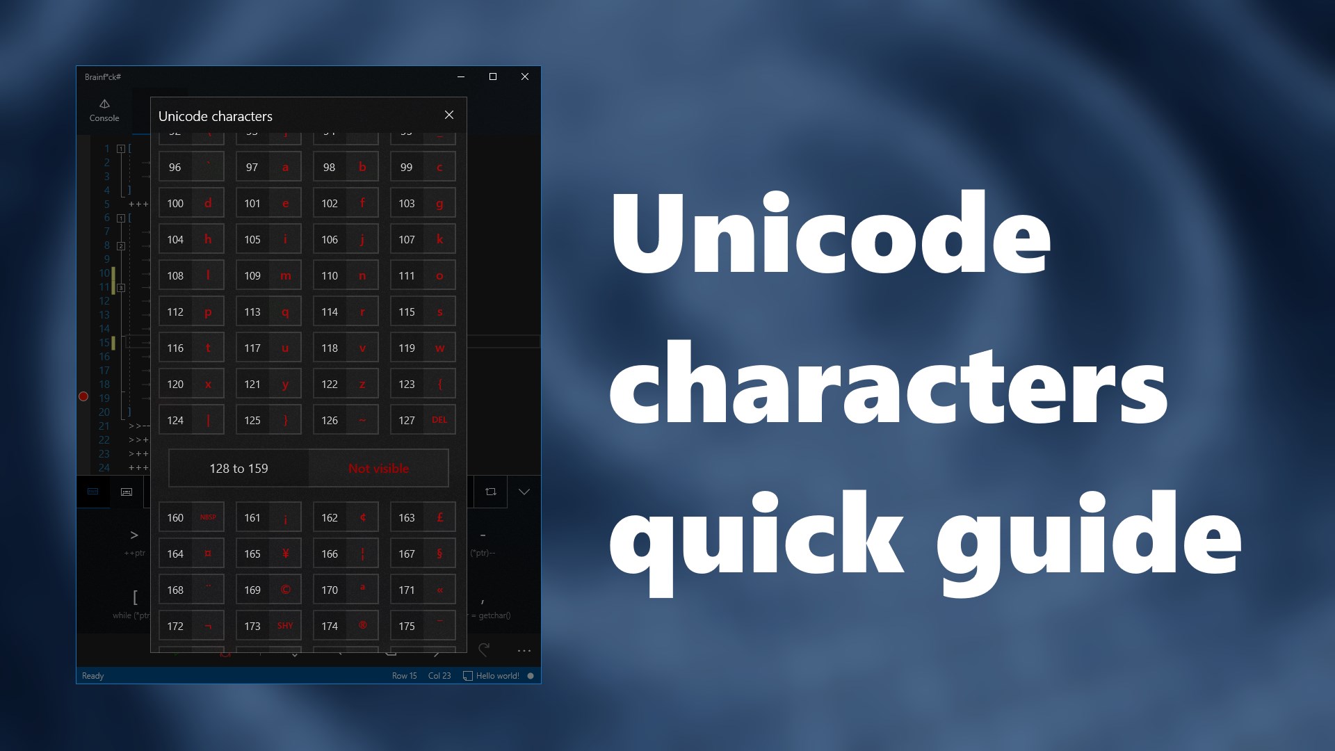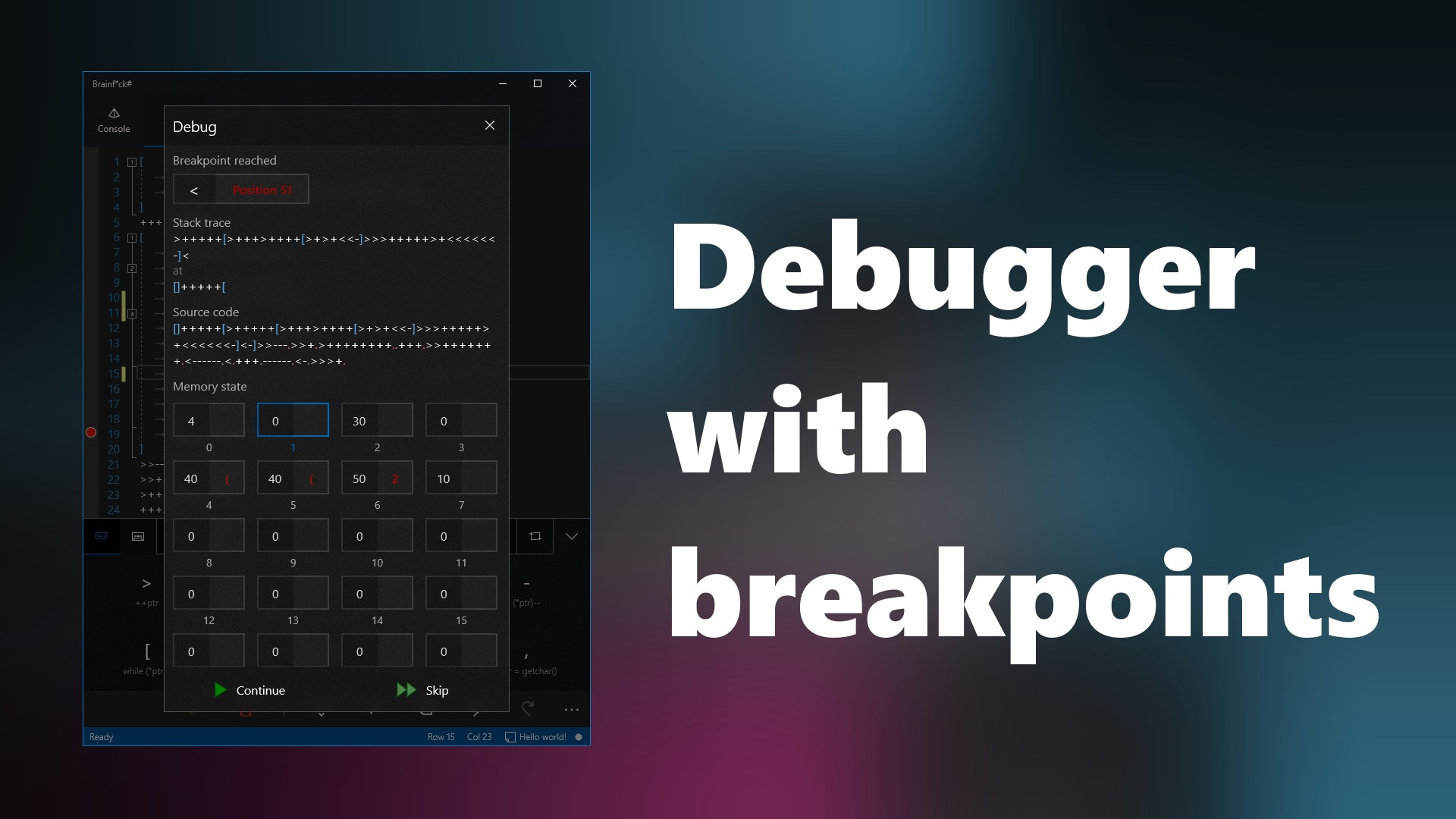 Brainf*ck# is the world's most advanced console/IDE and debugger for the Brainf*ck programming language, exclusively on Windows 10.