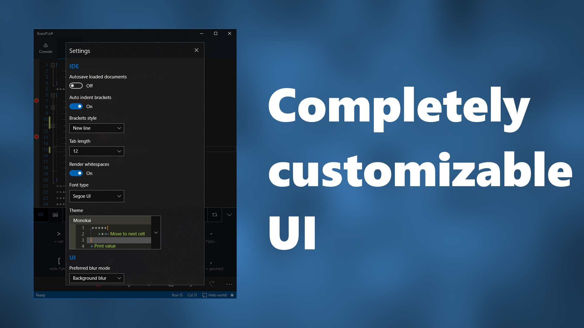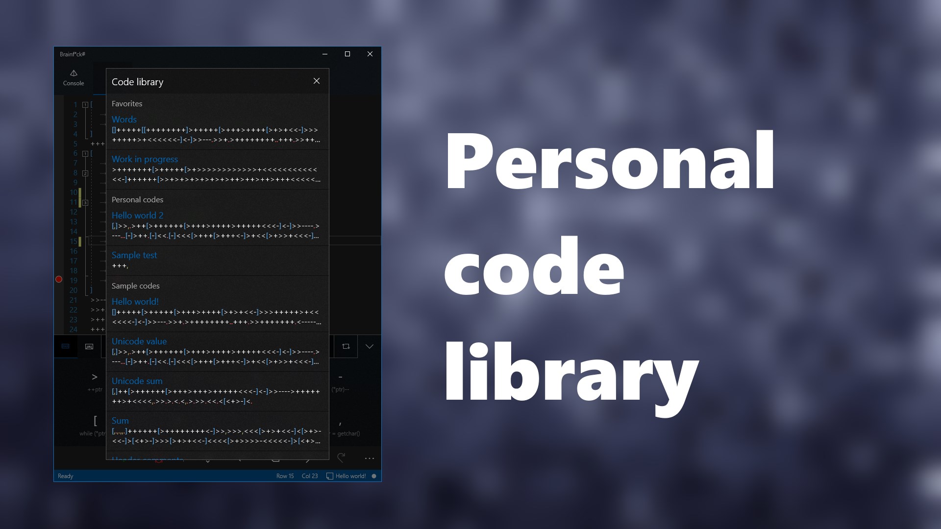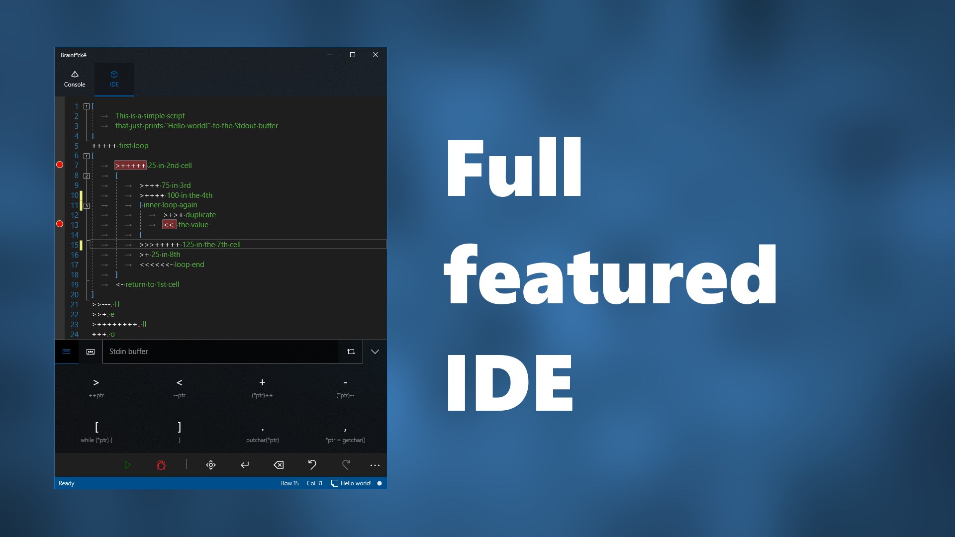 IDE with syntax highlight and code autocompletionIndentation depth indicators and column guidesGit diff markers to see the changes in the current code fileBreakpoints support with complete debugging experienceFull featured console to test your scripts and improve your coding levelReal time memory state with the all the info about every cell (value and Unicode character) and the pointer actual positionExceptions handler, infinite loops auto suppressionComplete 8 bit Unicode char table to help you code text prints and see the values of the characters in the Stdin bufferTouch friendly UI with on screen custom keyboard and dedicated text navigation buttonsUndo/redo features to help you write your code more easilyThe interpreter debugger tells you the position of the operator that caused an exception and displays the complete stack traceSave your scripts in your personal library shared across devices and edit them whenever you wantCustom overflow mode for the memory statePBrain extensions support to declare and call functionsWindows Timeline support to quickly continue working on other devices