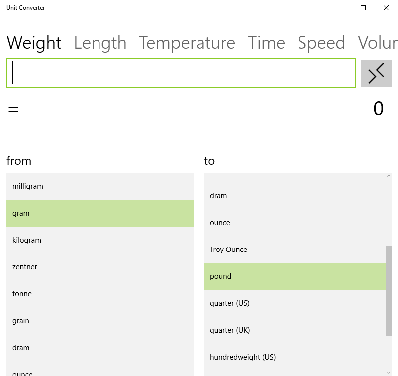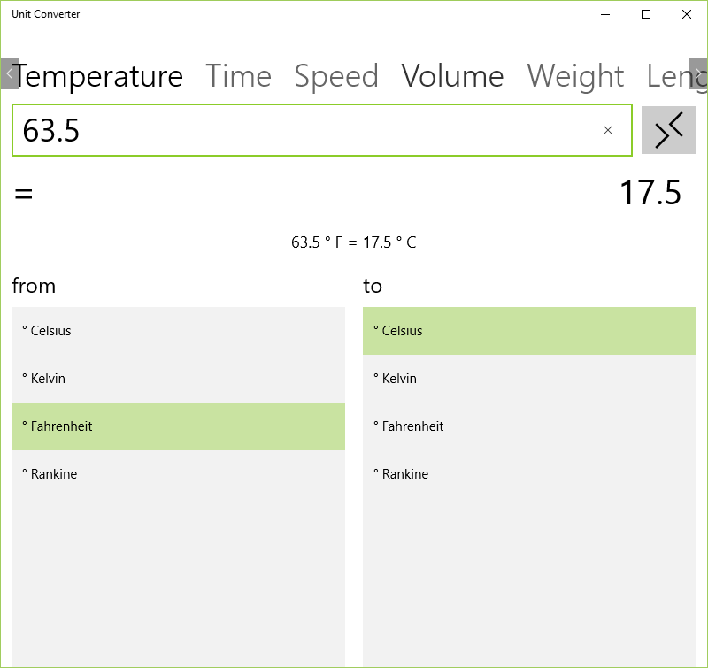 Unit Converter is a Windows pivot application that helps you to easily convert common units of volume, temperature, weight, speed, time and length into one another.