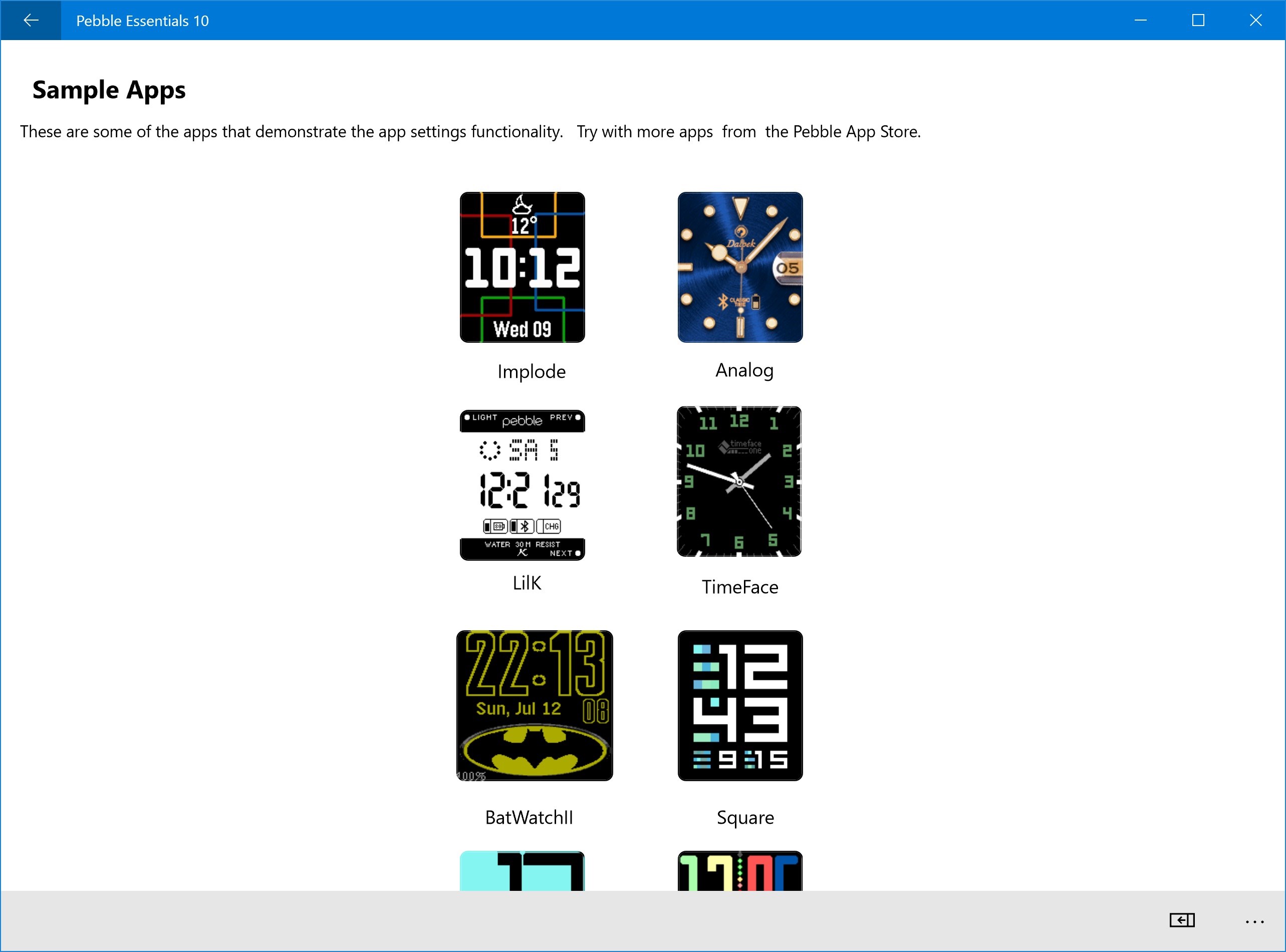 Note: None of the sample apps work for Pebble Classic (Version 2.X). More apps can be found from the Pebble App store.