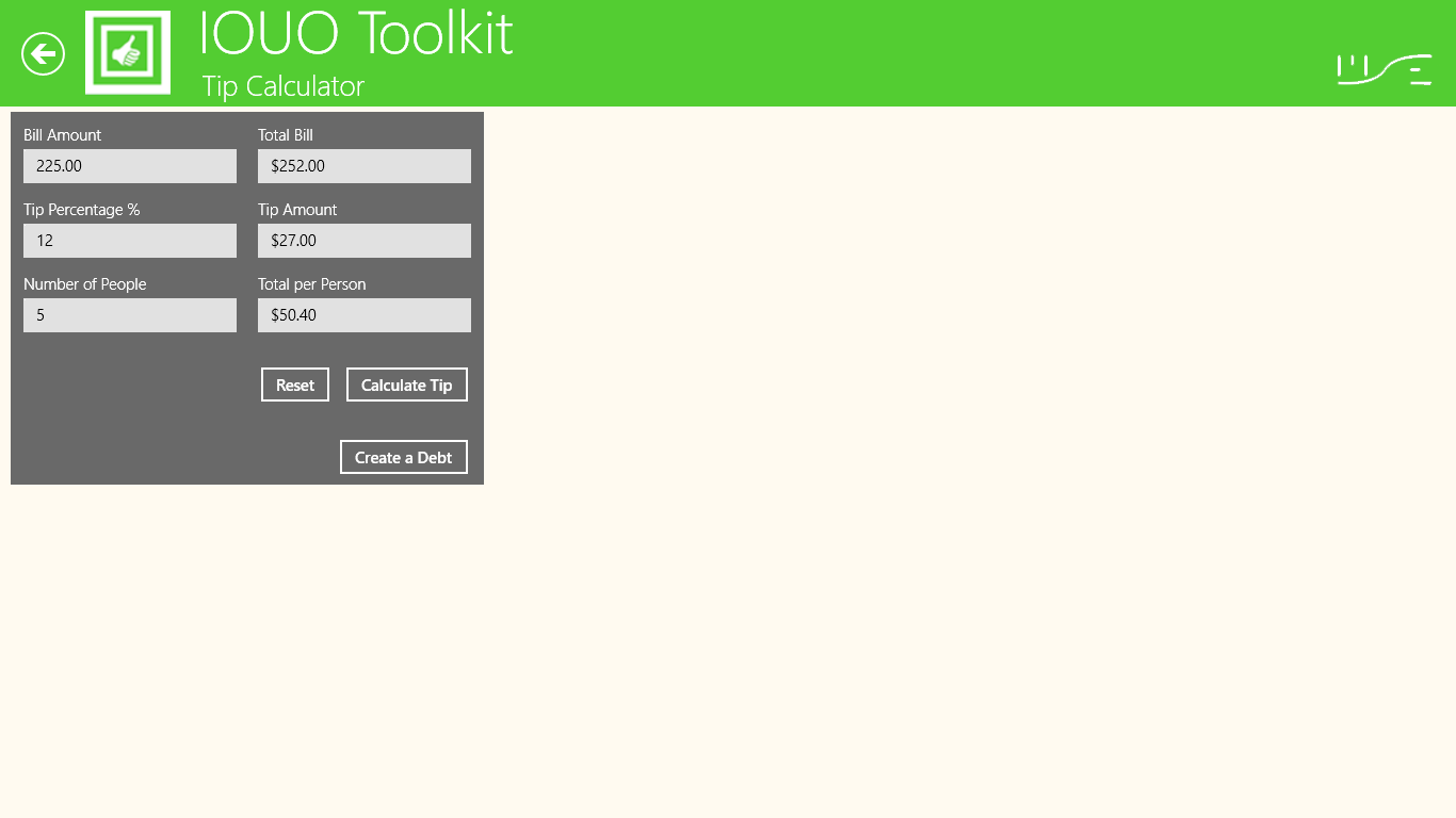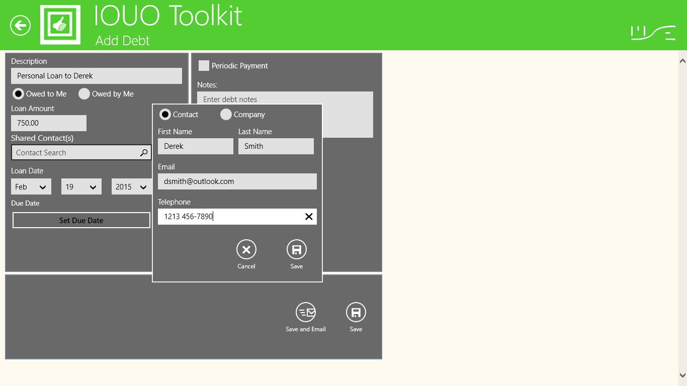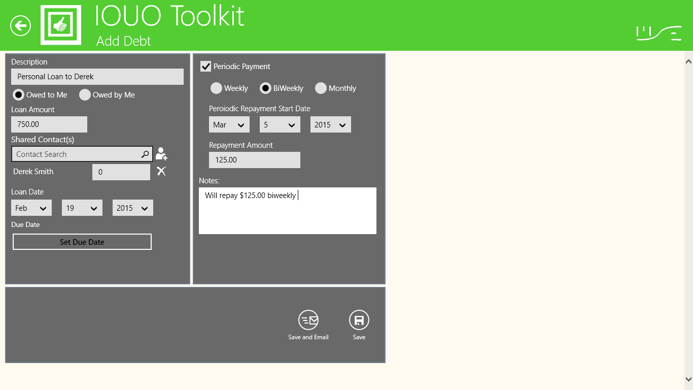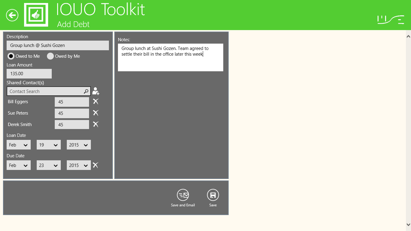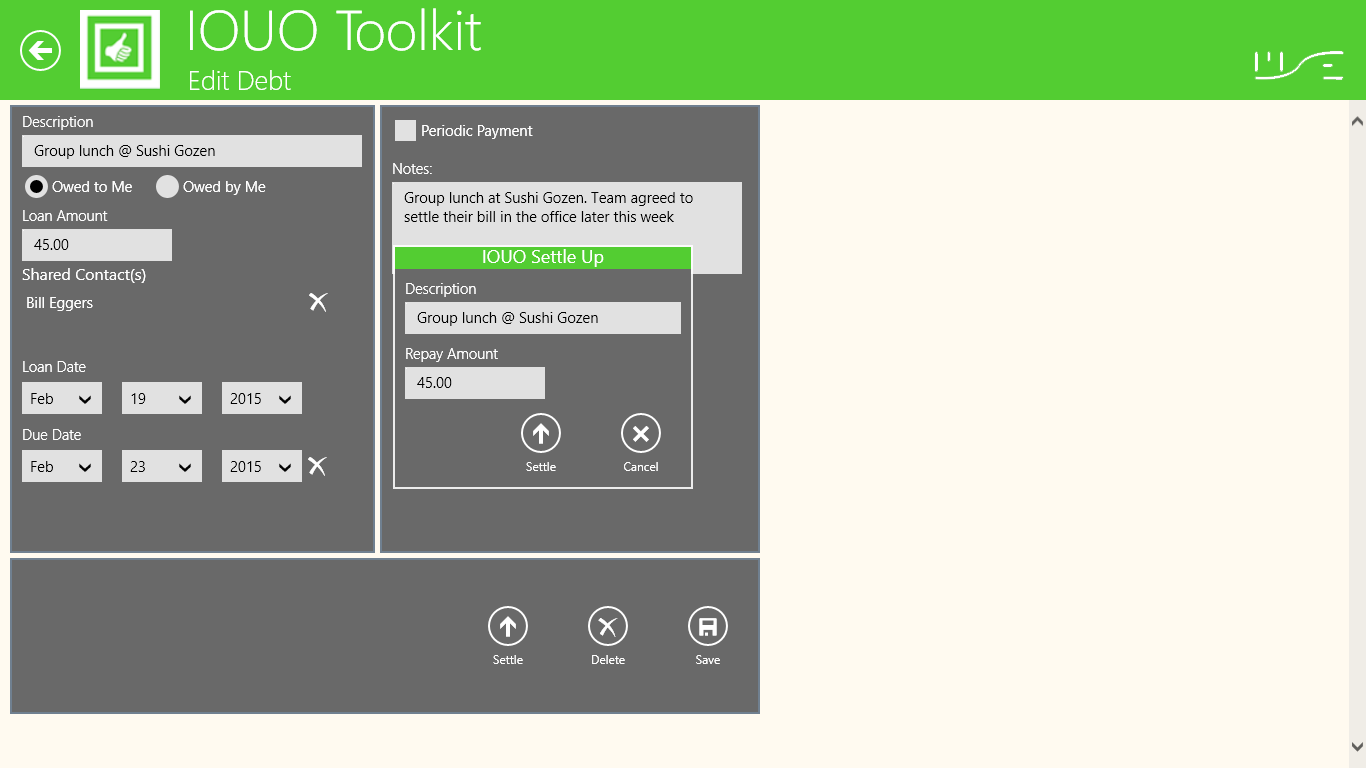 Ability to create and manage bi-directional personal debtsAbility to identify types of personal debts (loans and borrowed items)Ability to identify the IOUO application owner as the primary payerSeparate debts owed to me by contacts, and debts owed by me to contactsSummarize and total debts owed to me by contactAbility to add and manage multiple bi-directional debts for a single contactAbility to record and manage bi-directional periodic paymentsAbility to record and manage bi-directional partial paymentsProvide a view of debt record detailsProvide a view of partial payment historyProvide a view of recurring debt payment historySend email communication to contacts with debts owed to meAbility to identify overdue bi-directional debtsAbility to mark debts as repaidAble to create and manage a list of IOUO contactsAbility to calculate total shared debts (aka Tip Calculator)Ability to automatically create individual debts for multiple contactsAbility to add a note to each debt recordProvide access to a currency conversion toolHelp preference shows tool tips on each IOUO screen.