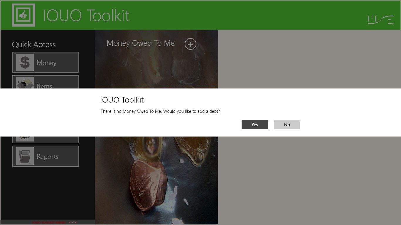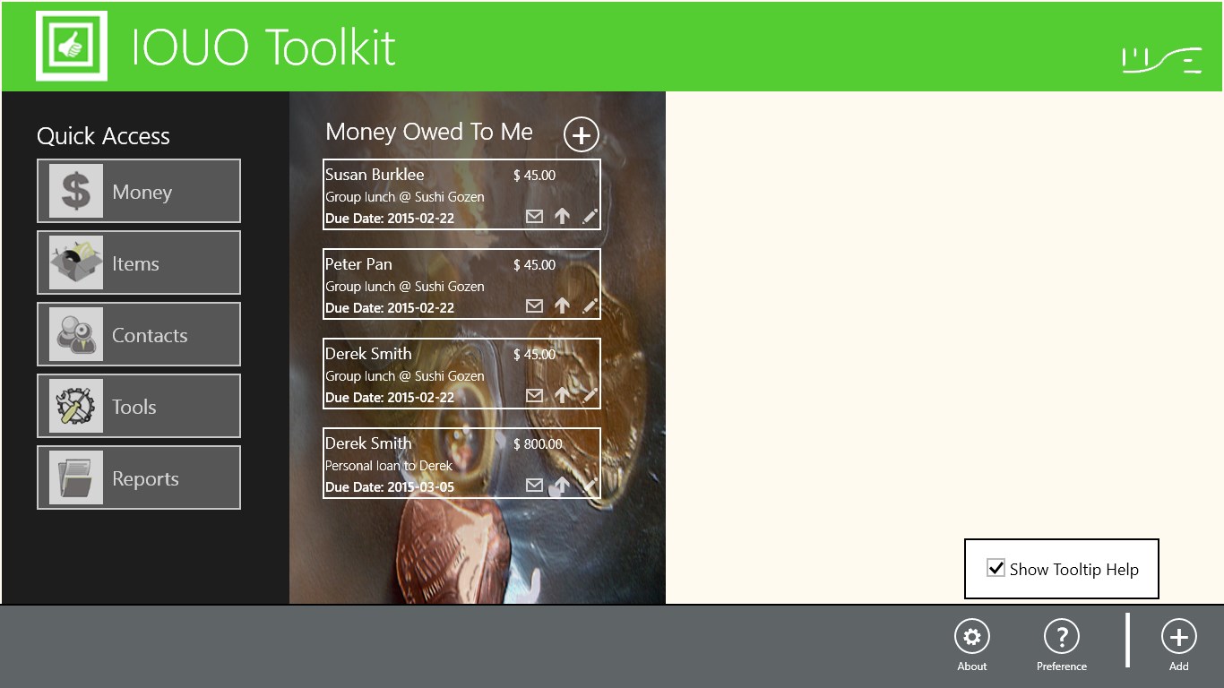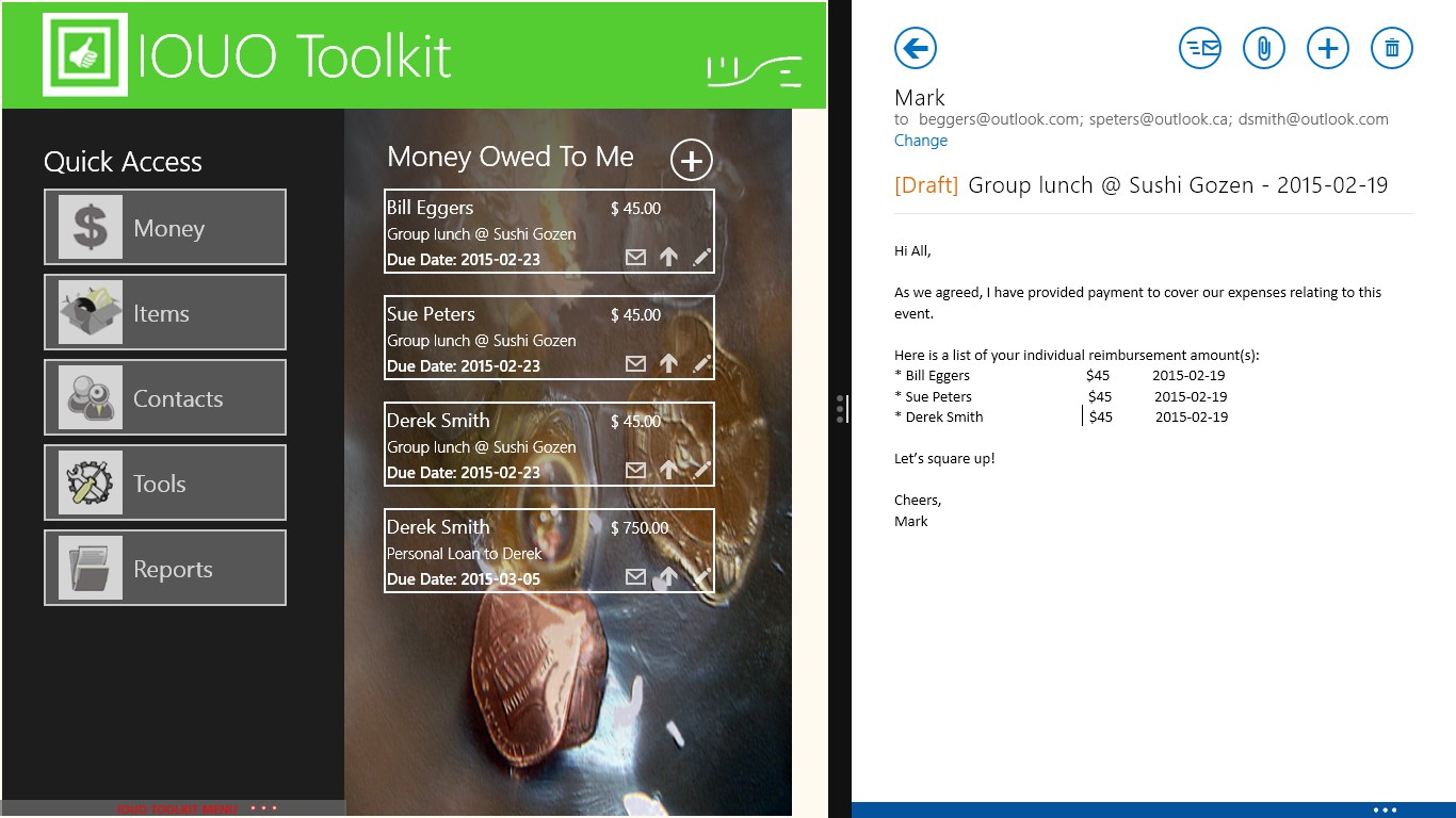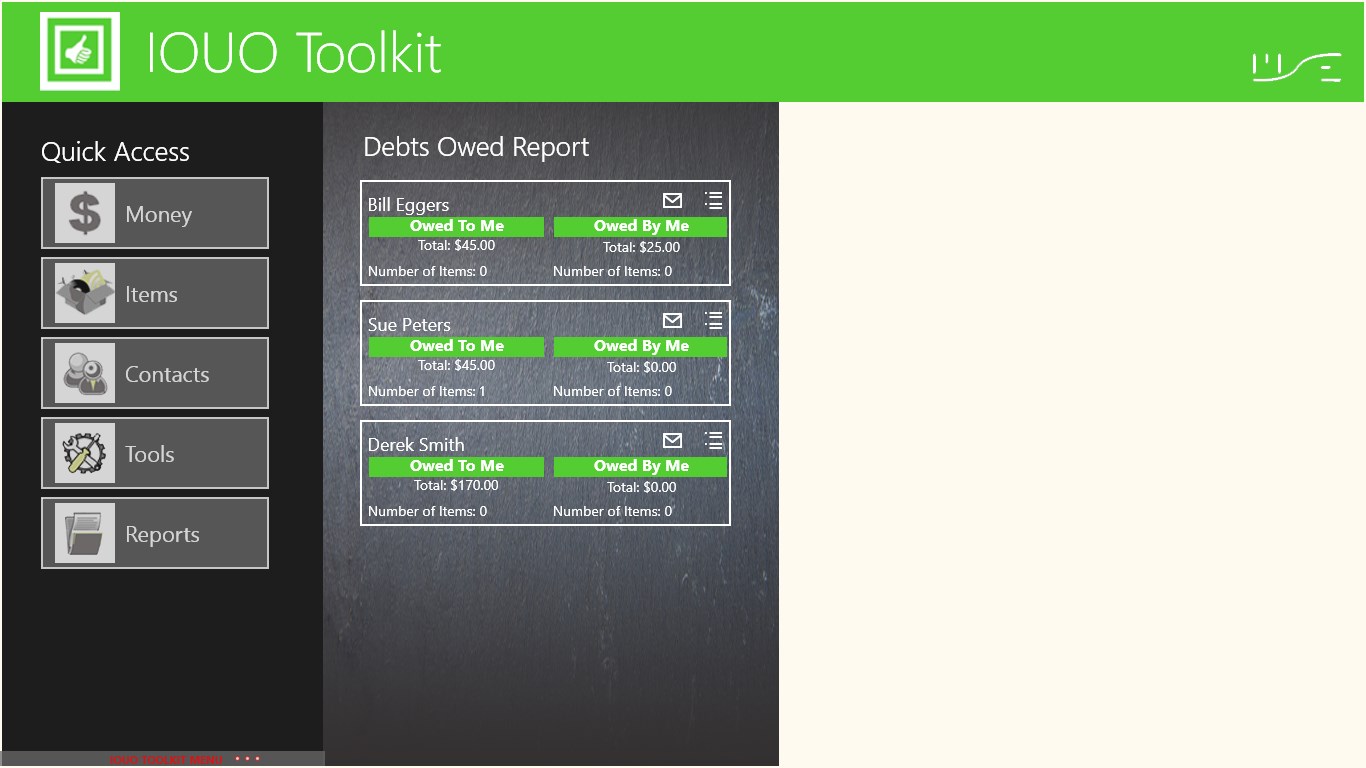 The IOUO Toolkit is an easy to use "I Owe You Owe" personal record management application. It monitors bi-directional personal debts such as personal loans and borrowed items. It tracks full and partial payments, maintains the repayment history of each debt and automatically decline debt balances.