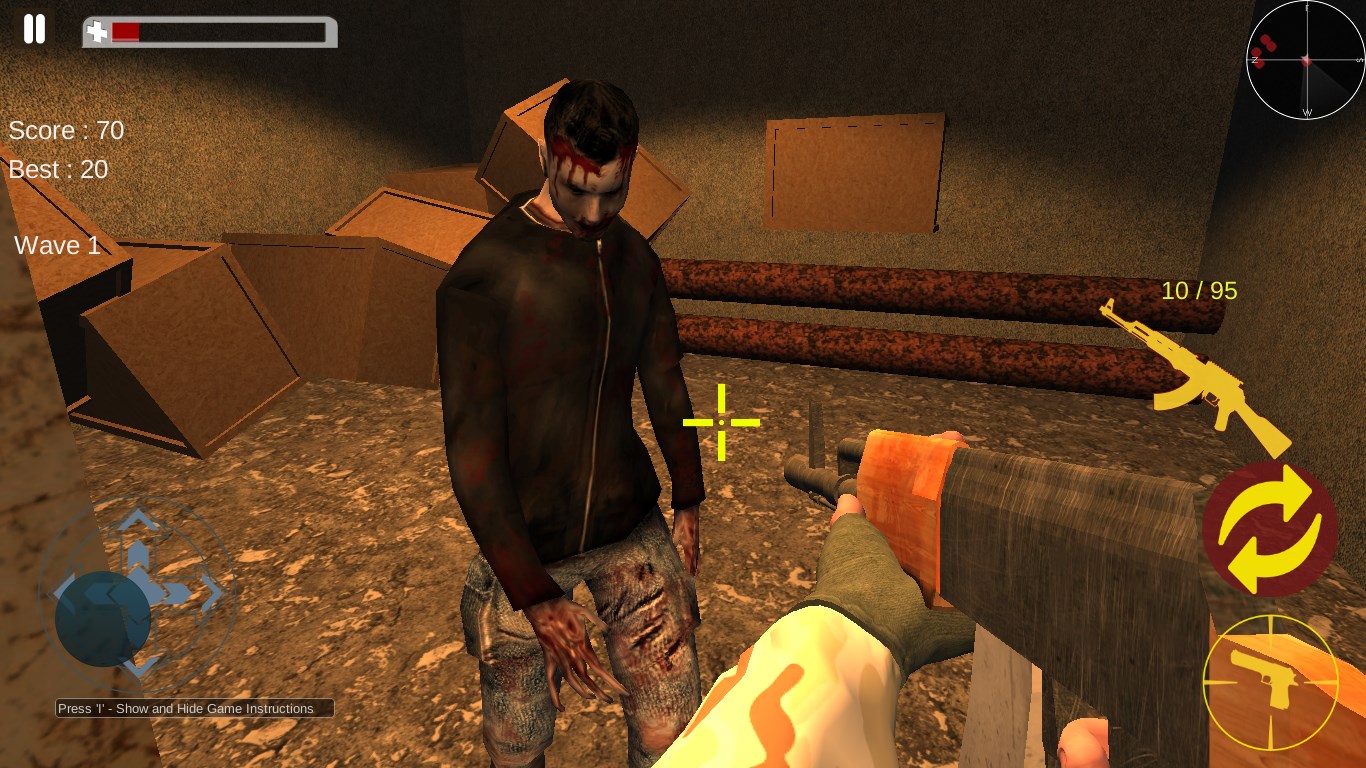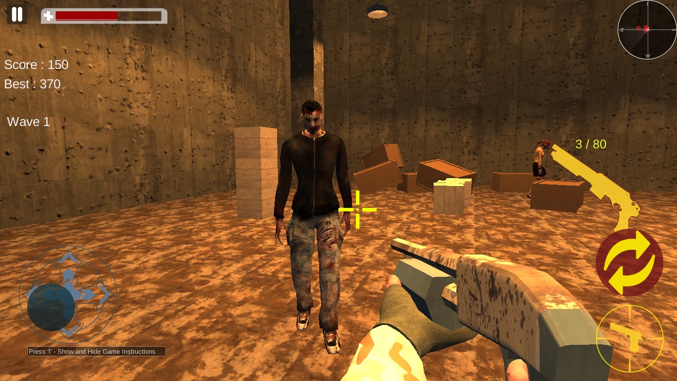 This is a 3D Game. It portrays all real world Zombies which are He-Zombies, She-Zombies and Big Fat Zombies. They are walking towards you all the times and they will attempt to kill you. The Big Fat Zombies appear only after a certain number of other Zombies are killed. The walking Zombies take less damage and can be killed in one shot whereas the Big Zombies take more assault.