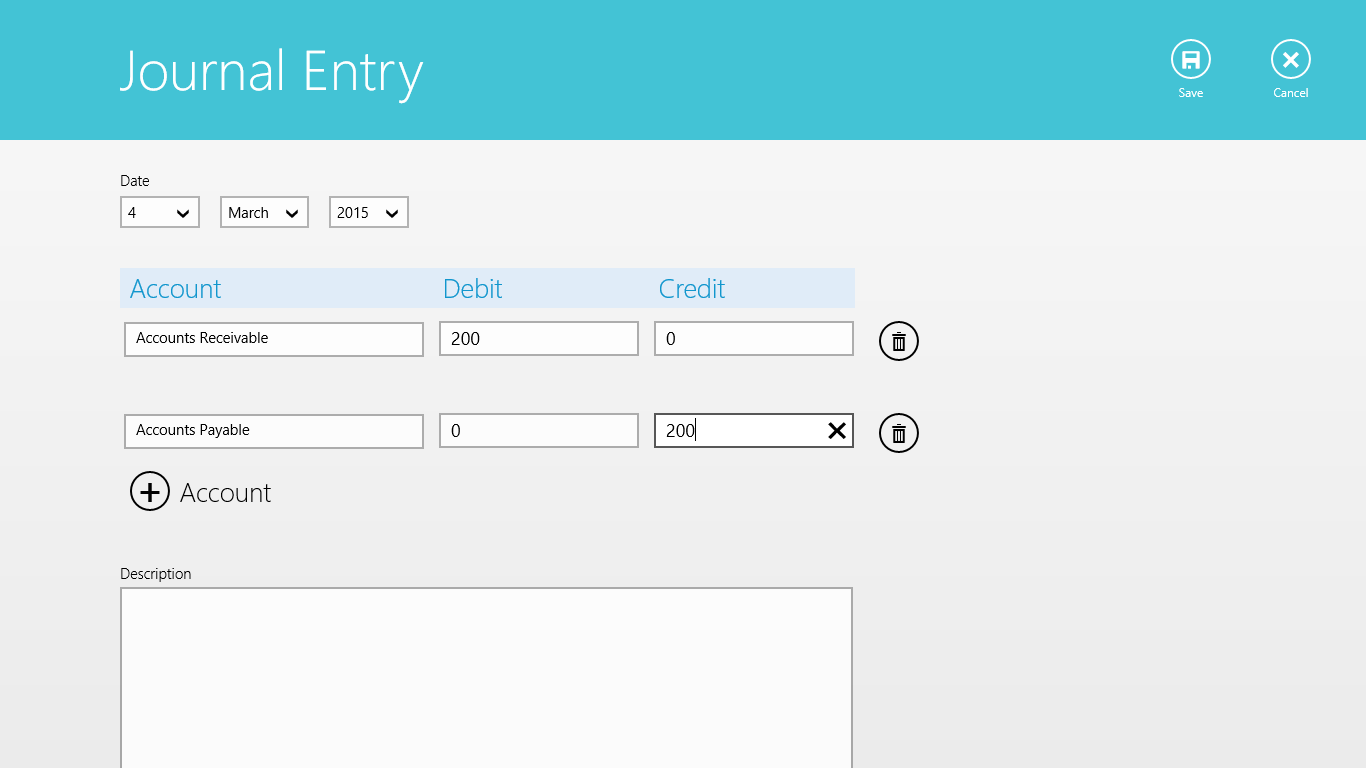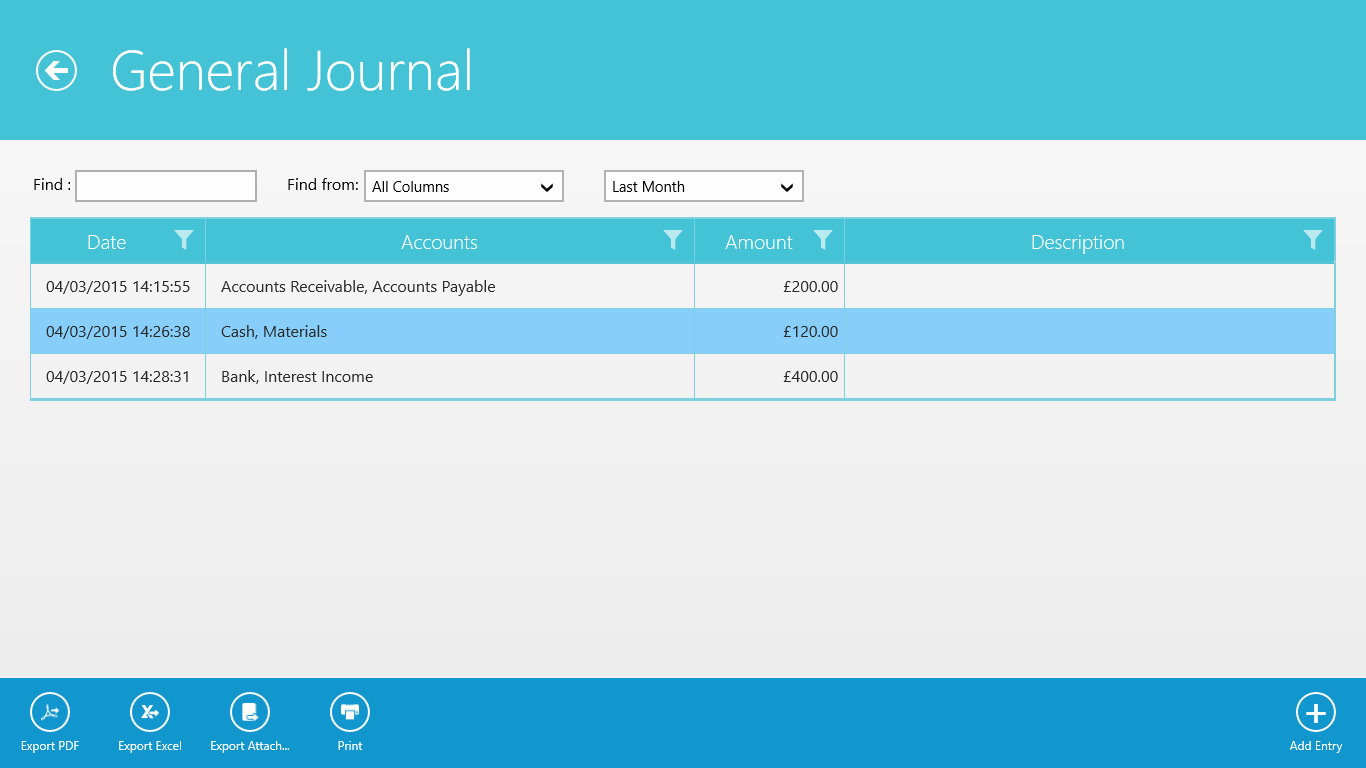 Add many photos, receipts or file attachments to each journal entry.Export data of General Journal and and associated Ledgers to Excel or PDF format files.Print your data directly from the General Journal or from its associated Ledgers.Export photos and file attachments into a zipped folder.Multiple backup and restore options.A PIN can be set from the Settings Charm in the Charms Bar to protect your data.Data can be saved to your OneDrive account and can be accessed from different devices.