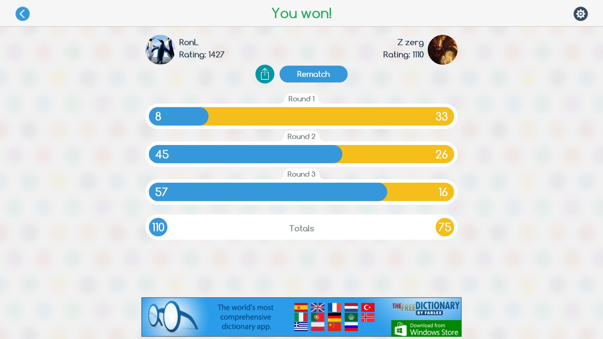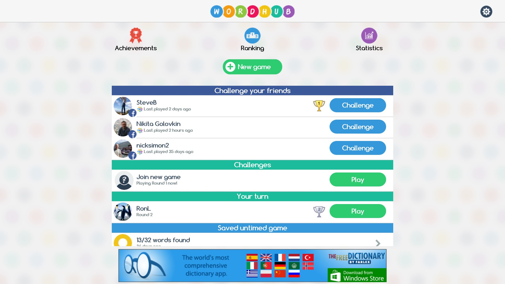 * See which of your friends are already playing, then challenge them! Or go up against random opponents across all platforms of the WordHub arena. Play on any device!