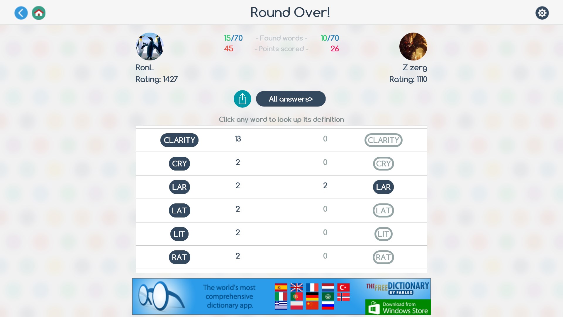 Build as many words as you can from the letters in the secret word scramble!See which of your friends are already playing, then challenge them!Challenge yourself! With two modes of single-player gameplay.Unlock badges for in-game achievements.Learn new words and boost your vocabulary.