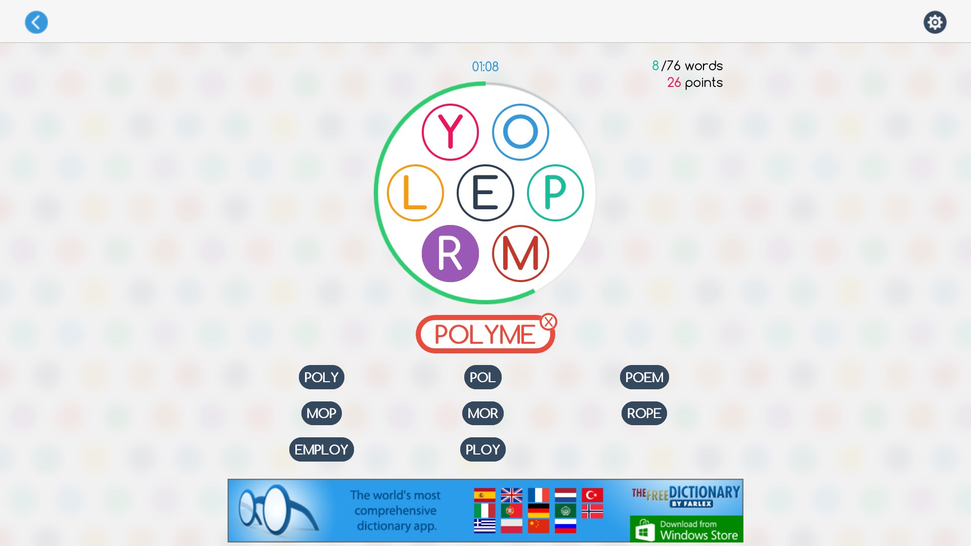 In WordHub, you must build as many words as you can from the letters inside the word wheel. Can you find the secret 7-letter word every round? Features single and multiplayer and timed and untimed games.