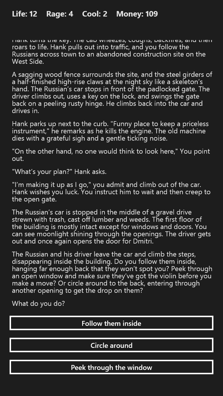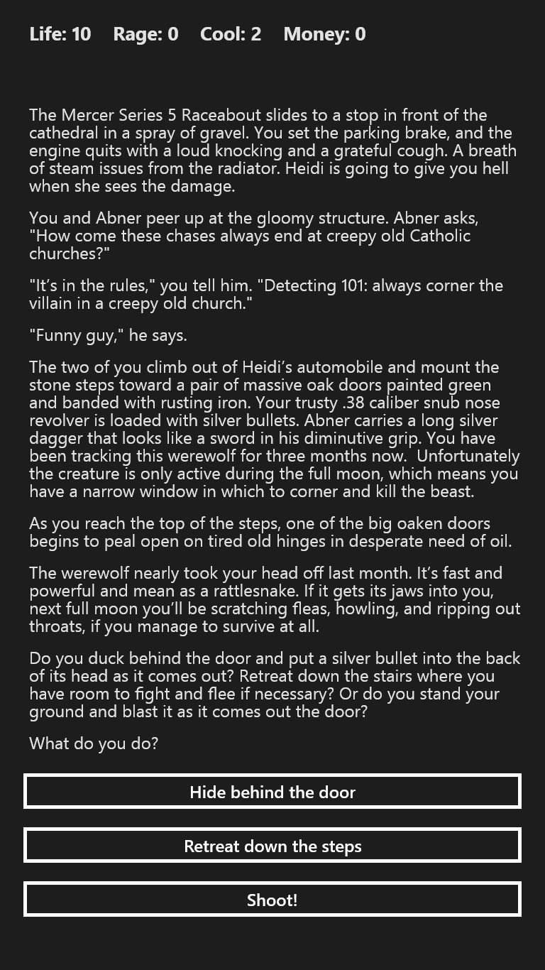 A beautiful dame hires you for what looks like a routine job. You should have known better. The mob, mysterious homicidal maniacs, and... Werewolves? It's a wild ride like nothing else you'll experience in a game!