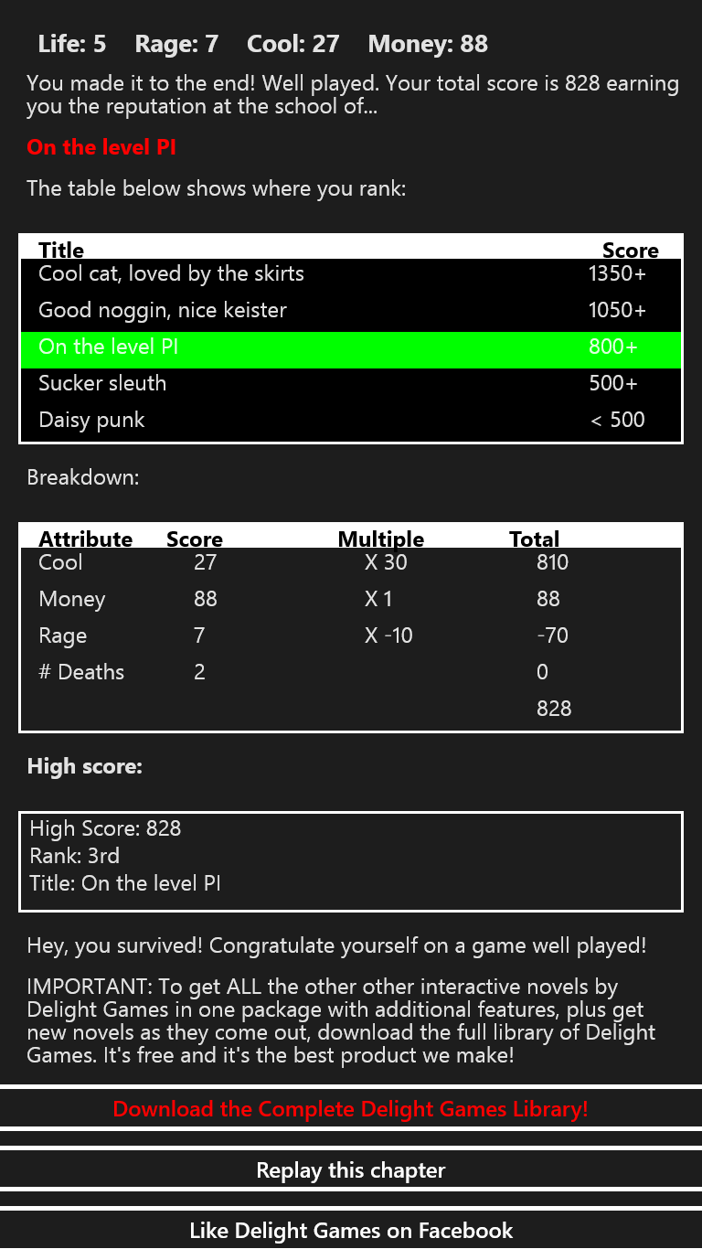 Make choices for the main character in the novel.At the end, get a score and rank. Play over and over to see what happens if you made other choices.