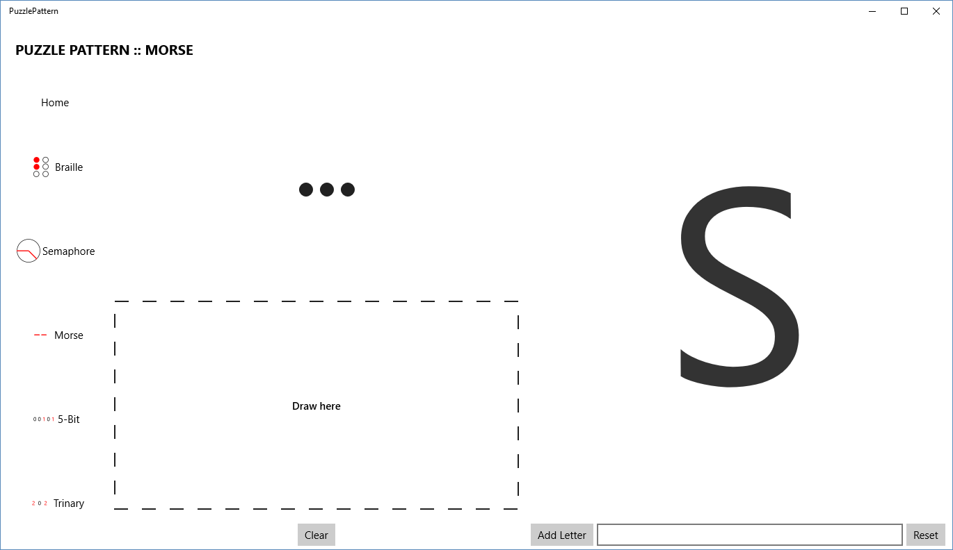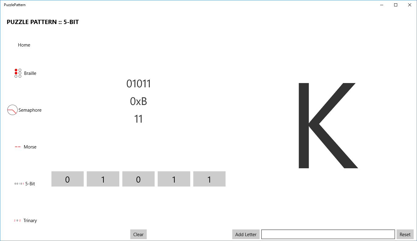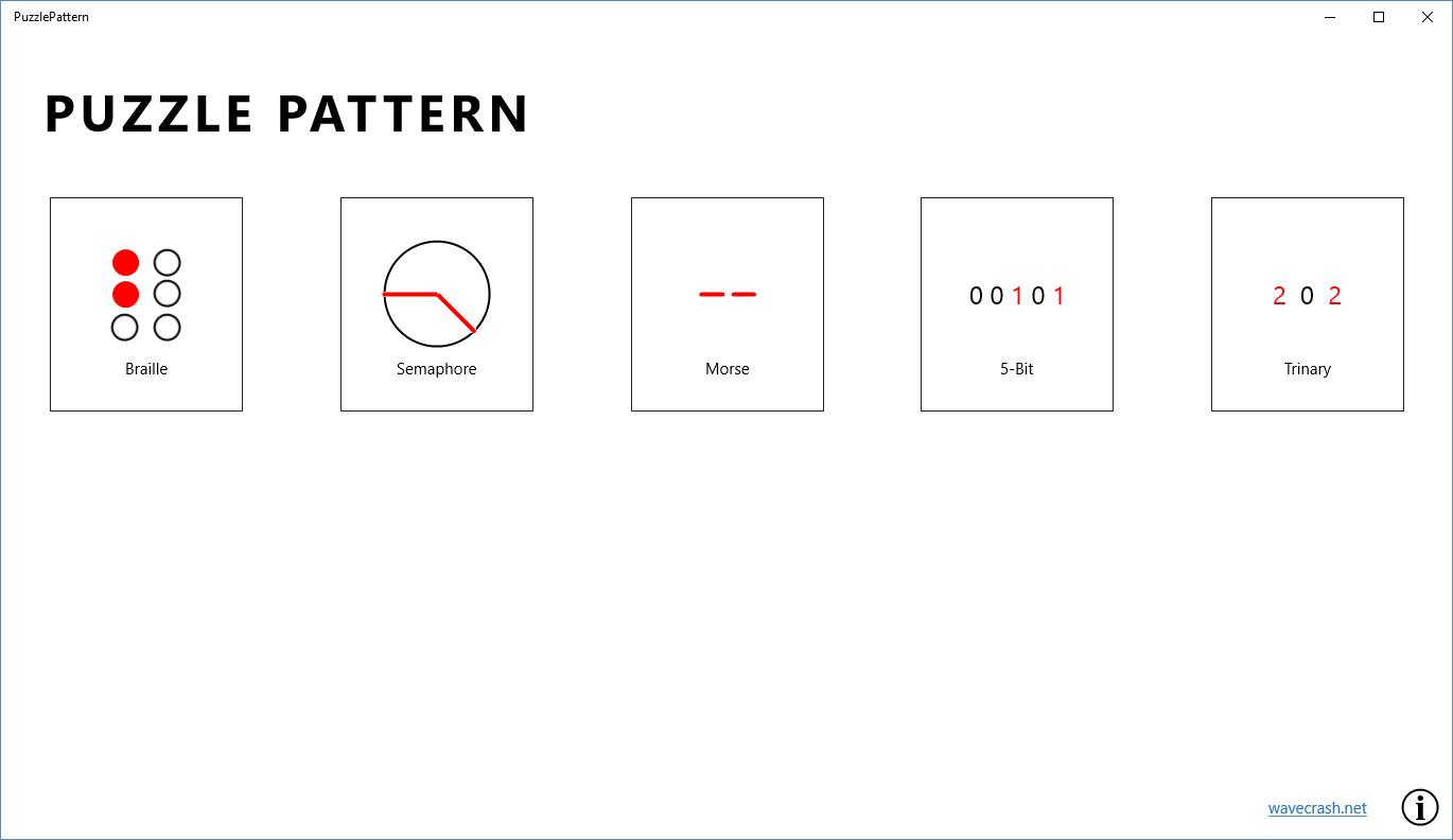PuzzlePattern helps you solve common puzzle encodings faster! Easily decode braille, semaphore (flags), morse, 5-bit, and trinary encodings.