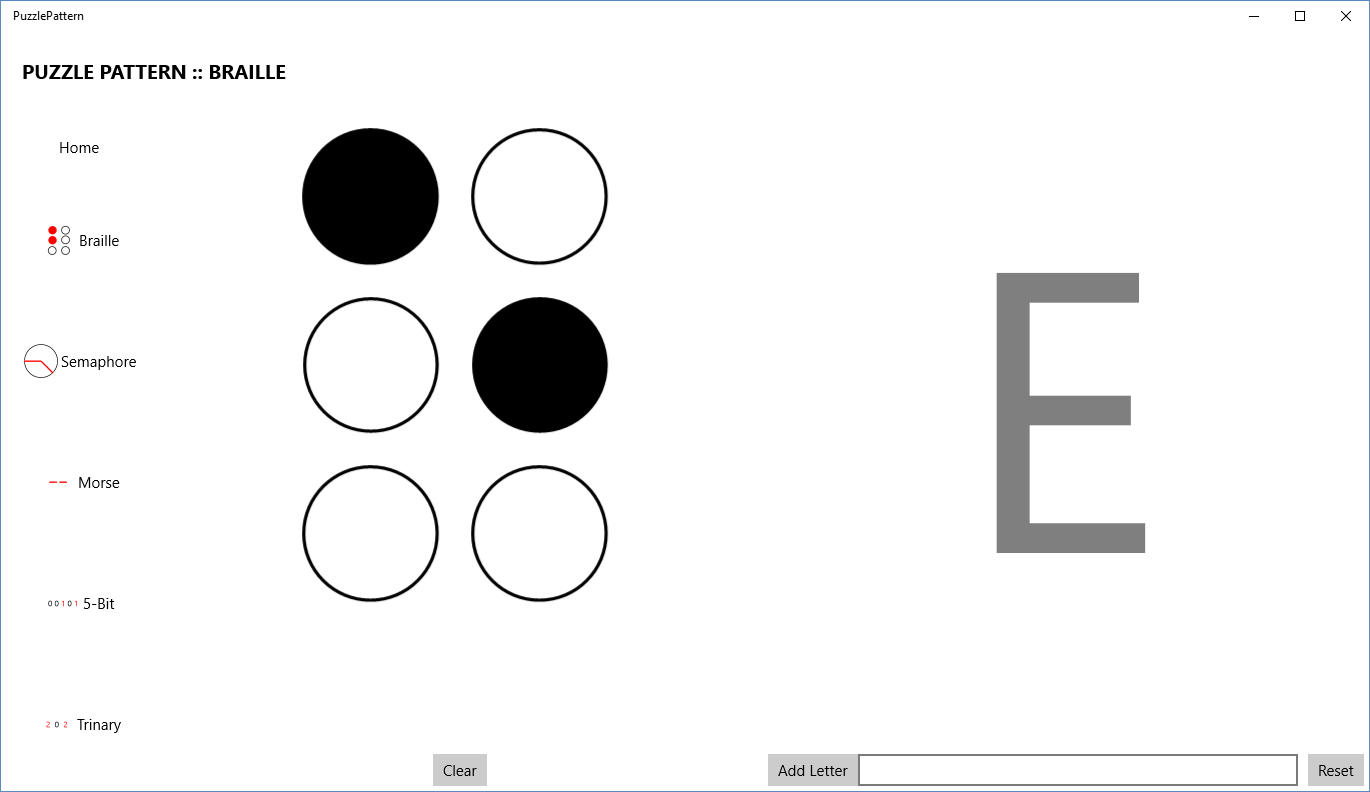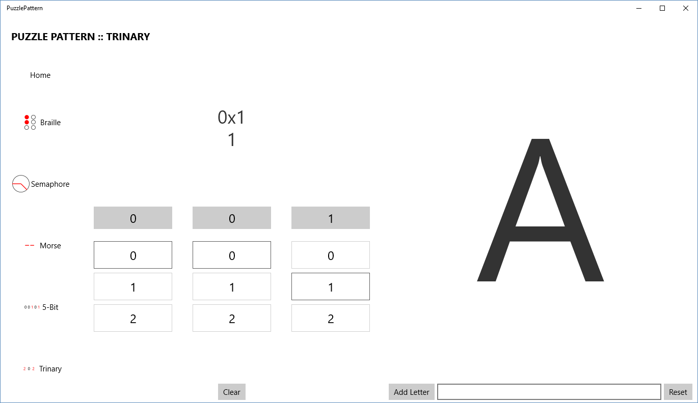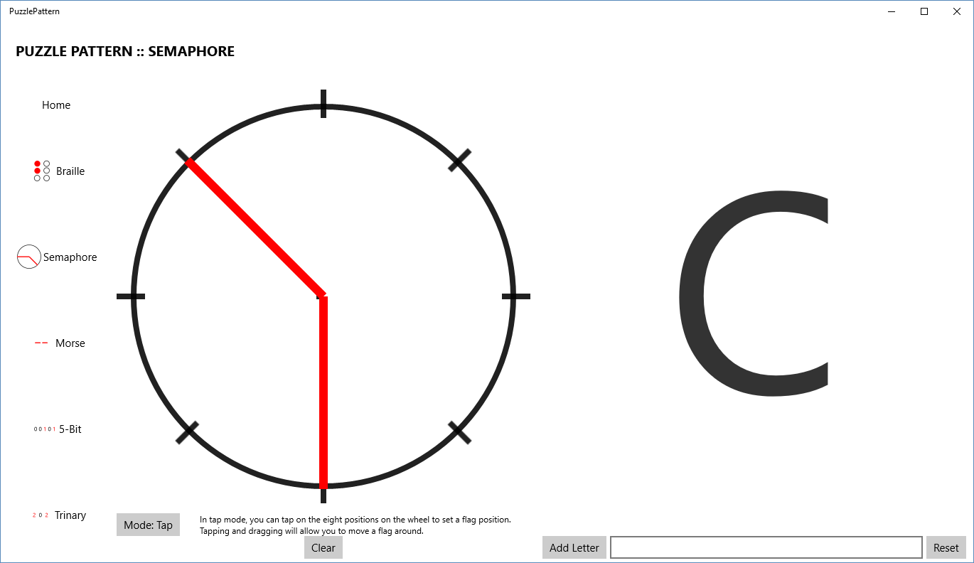 PuzzlePattern helps you solve common puzzle encodings faster! Easily decode braille, semaphore (flags), morse, 5-bit, and trinary encodings.