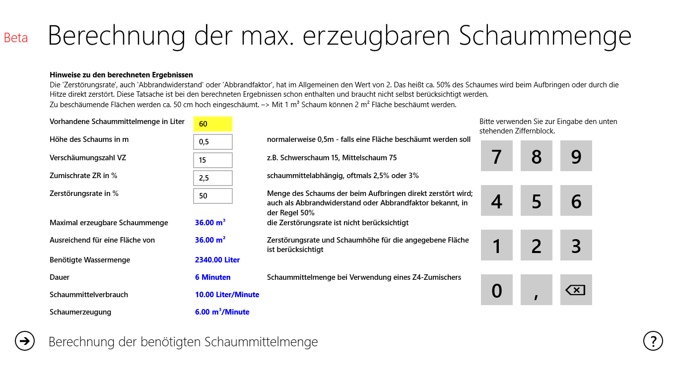 Mit dieser App lassen sich Schaumberechnungen durchführen. Entweder berechnet man an Hand der vorhandenen Schaummittelmenge, wie viel Schaum berechnet werden kann oder man wählt den umgekehrten Weg, um die Menge an Schaummittel zu ermitteln, die für eine bestimmer Fläche oder Volumen benötigt wird.