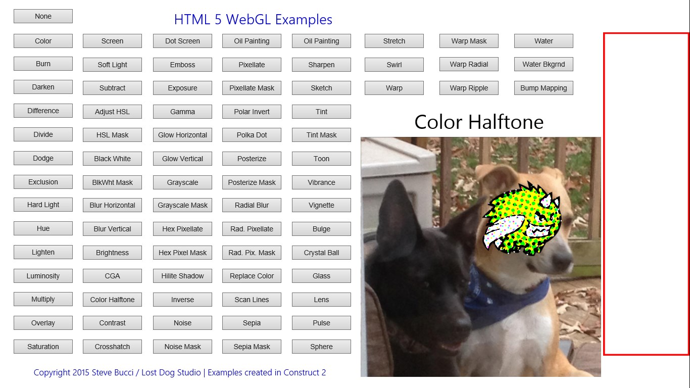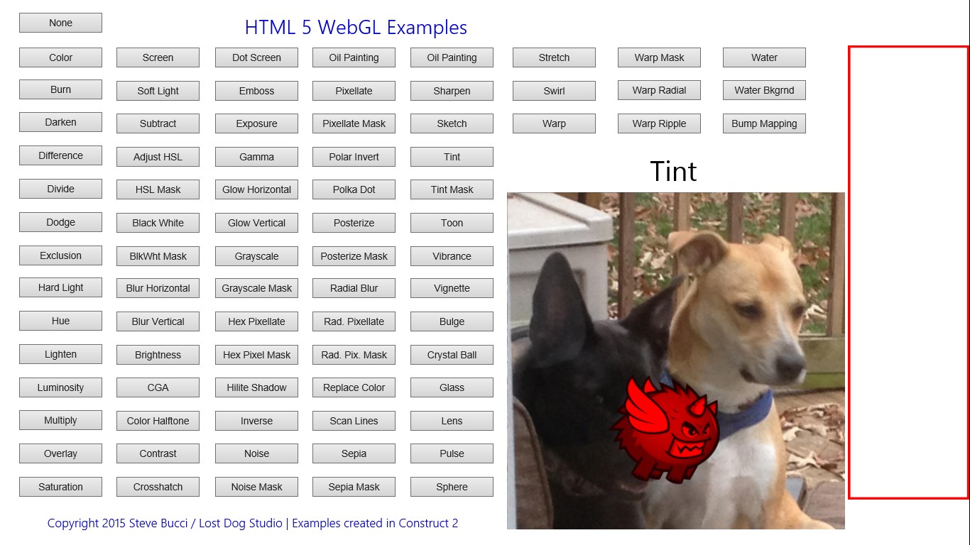 Over 80 WebGL effectsHTML5 based application with effects from Construct 2 based on WebGL standards