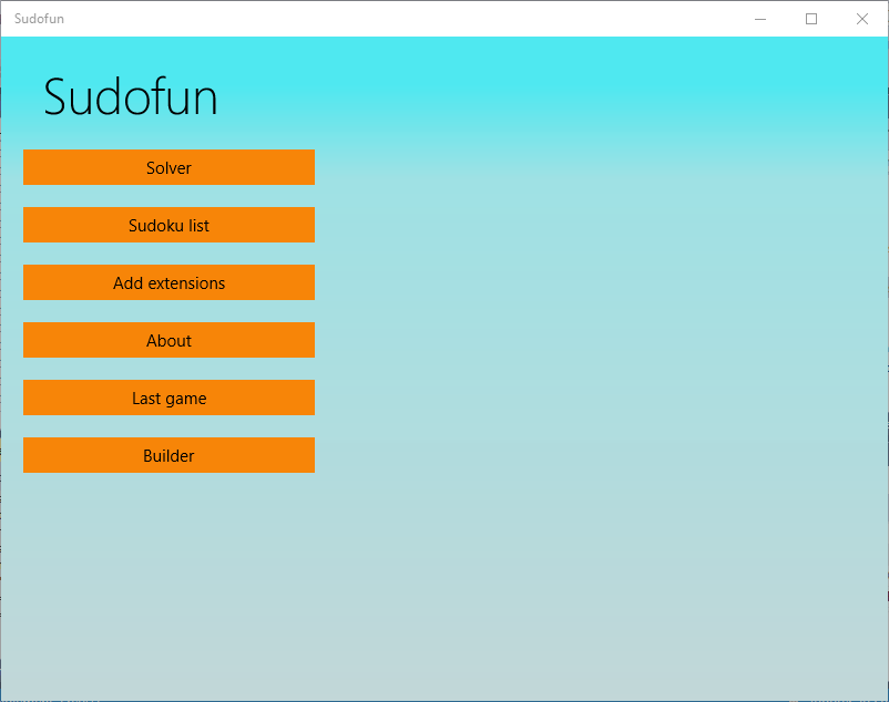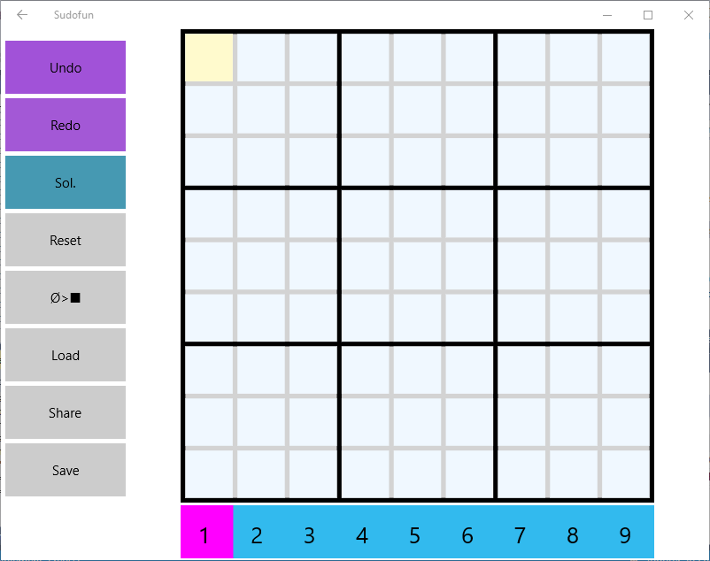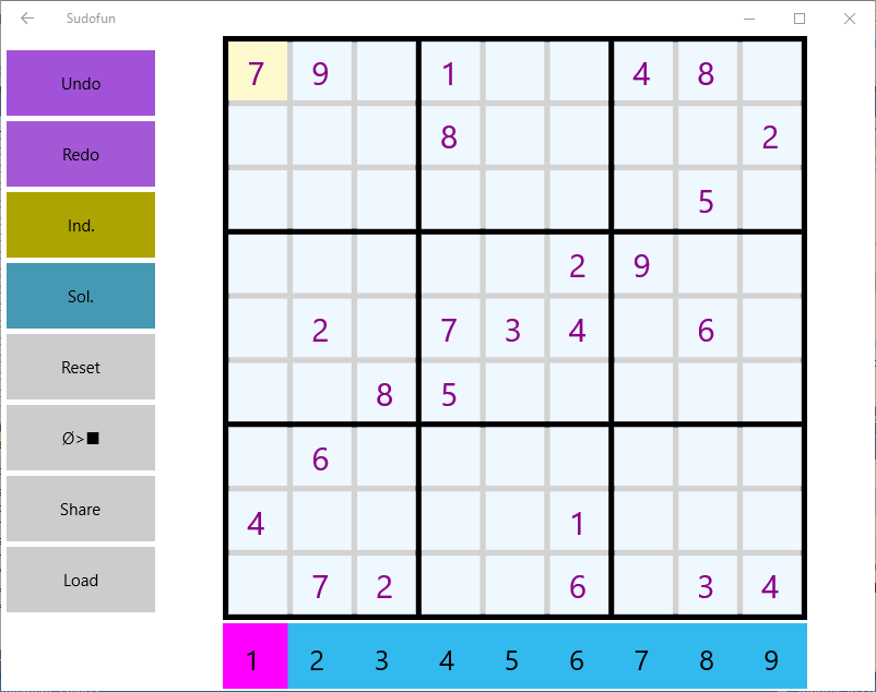 Sudoku solver and builderSudoku list (different difficulty levels)Supports touch, mouse and keyboard inputCollision detectionAlert case of future blockingDetection of the uniqueness of the solution to a sudokuUndo, RedoIndication, full solutionPossibilities of numbers on boxesSharing sudoku in different formats (text, HTML, image)Load and save Sudokus