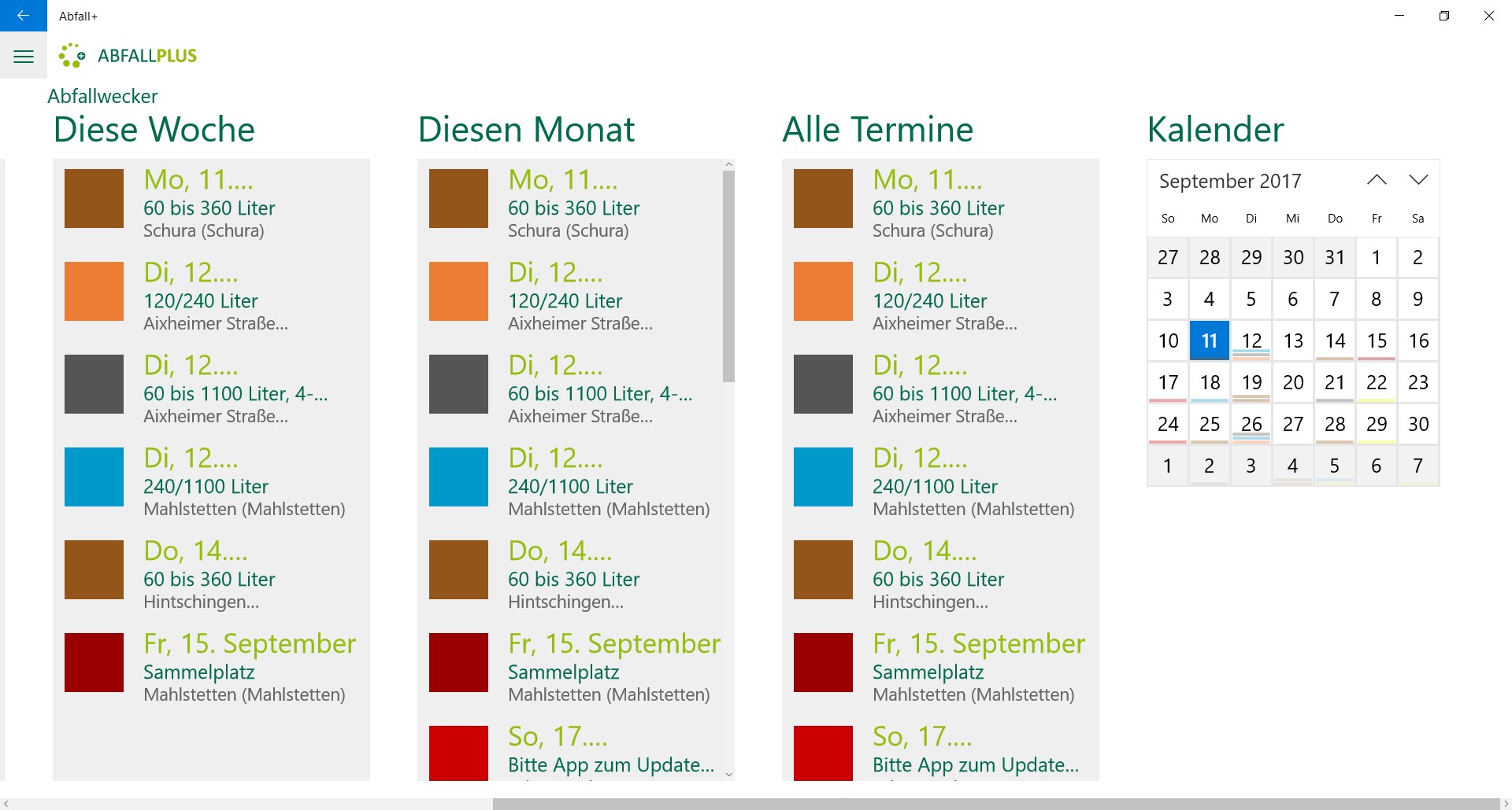 - Abfallarten filtern (z.B. nur Restmüll und Biotonnen)
