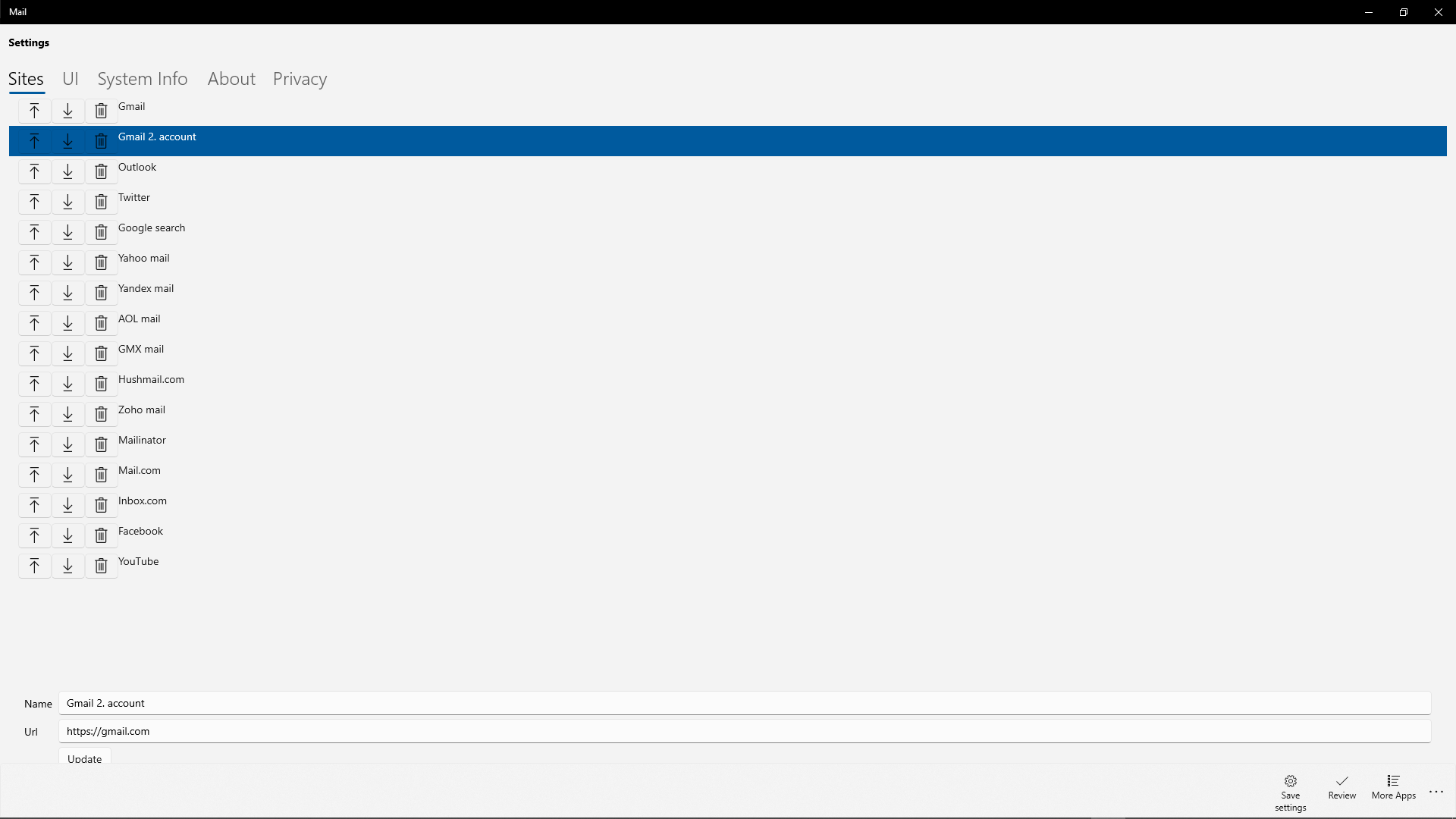 • In the Sites page you can easily reorder, delete, add new or rename your email providers.