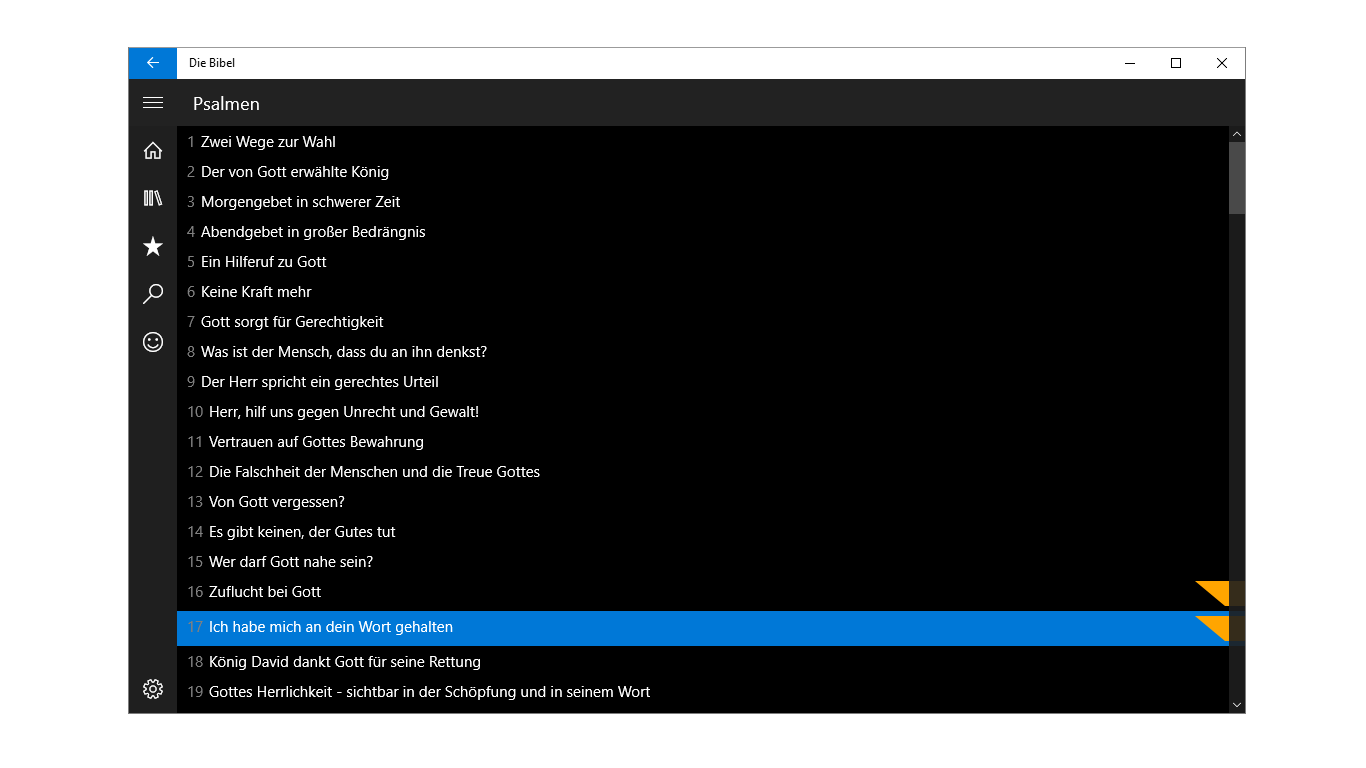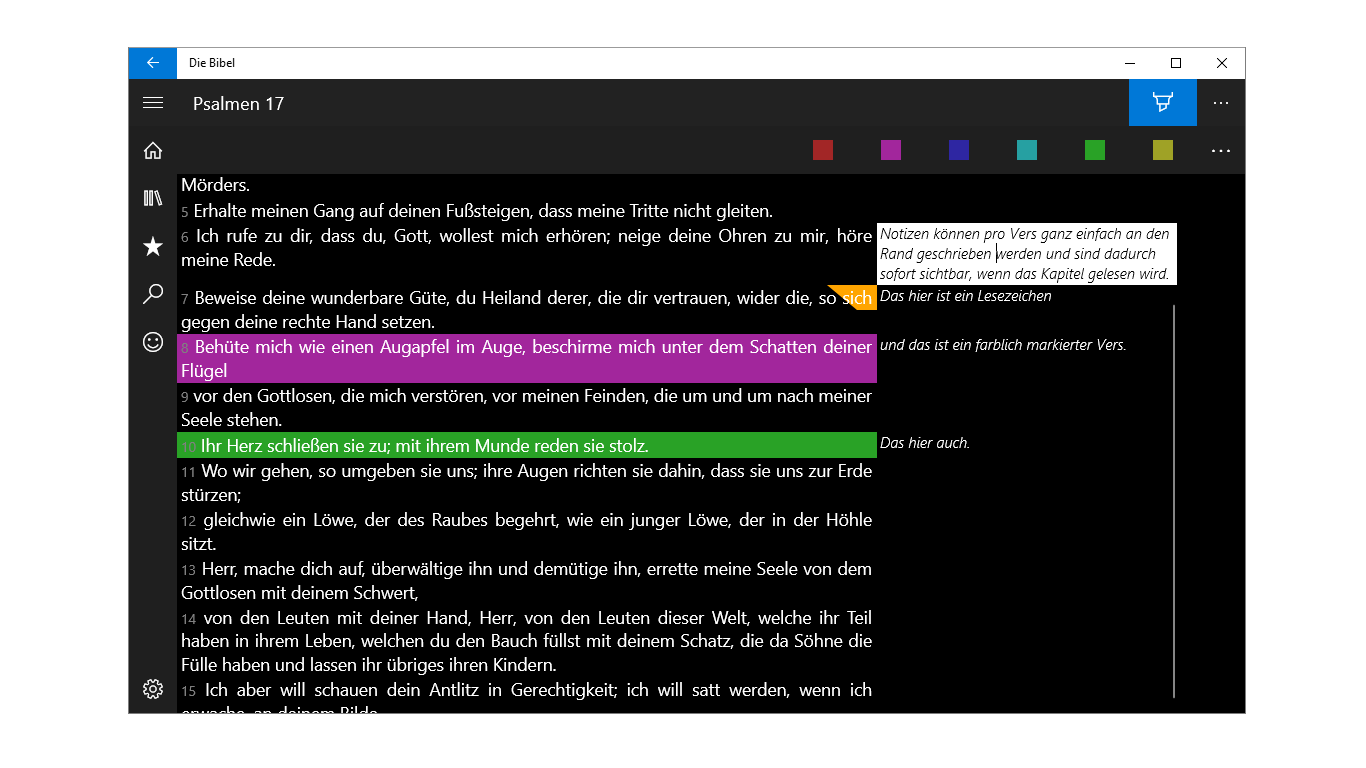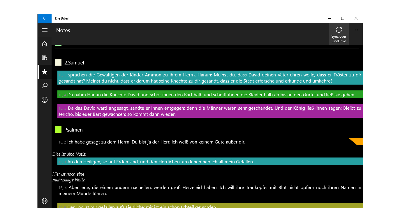 This bible reading app contains German and English Bible text. Each verse can be viewed and compared per click in various Bible translations such as the "Schlachter 2000", the "New King James Version" and the "Neue Genfer Translation". Verses can be found, highlighted*, sent to friends and bookmarked. In addition, notes can be written directly next to the Bible text and are thus immediately visible when reading the verses. These notes, bookmarks, and highlights can then synced* between different devices.