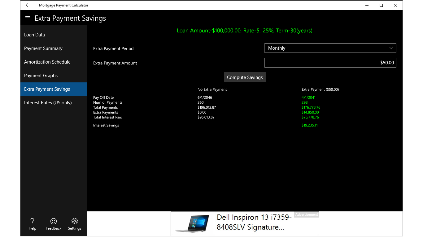 Calculates monthly mortgage paymentCan handle different compounding periods other than monthlyProvides amortization scheduleComputes savings in interest payment based on extra payments monthly and other periods as wellDisplays the various payment data in easy to understand graphsHas the ability to email the summary and schedule to self or anyoneProvides daily interest rates from zillowUsers can export the amortization schedule to an excel file