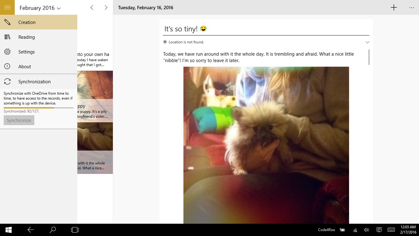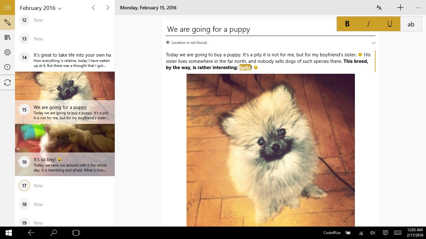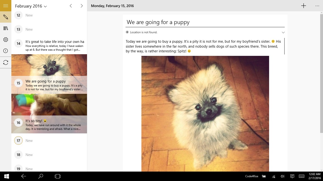 Simple, easy and beautiful interface;PIN to protect your diary;Text Formatting;Adding images;Location sensing;Auto save;Synchronization with OneDrive;Dark and light themes supporting (soon).