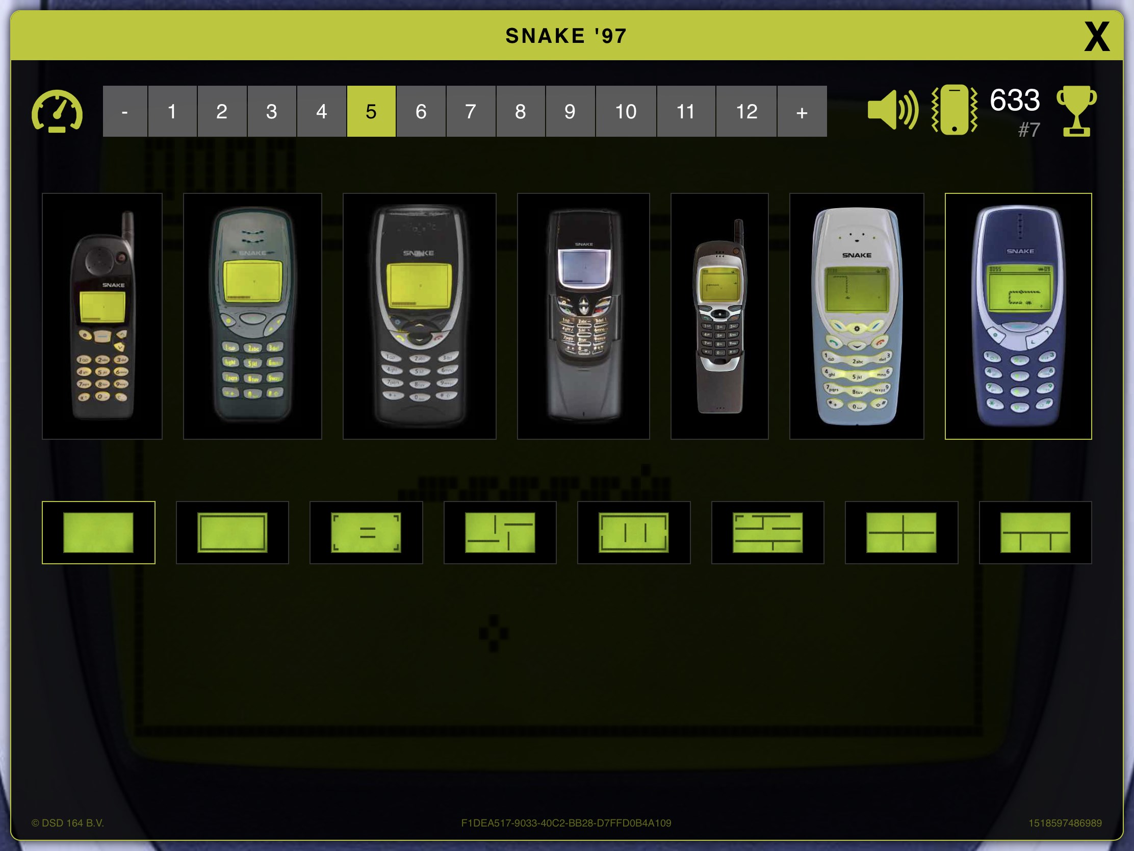 - 7 classic game modes (5110, 3210, 8210, 8850 and 3310, 3410 and 7110 with Snake 2)
