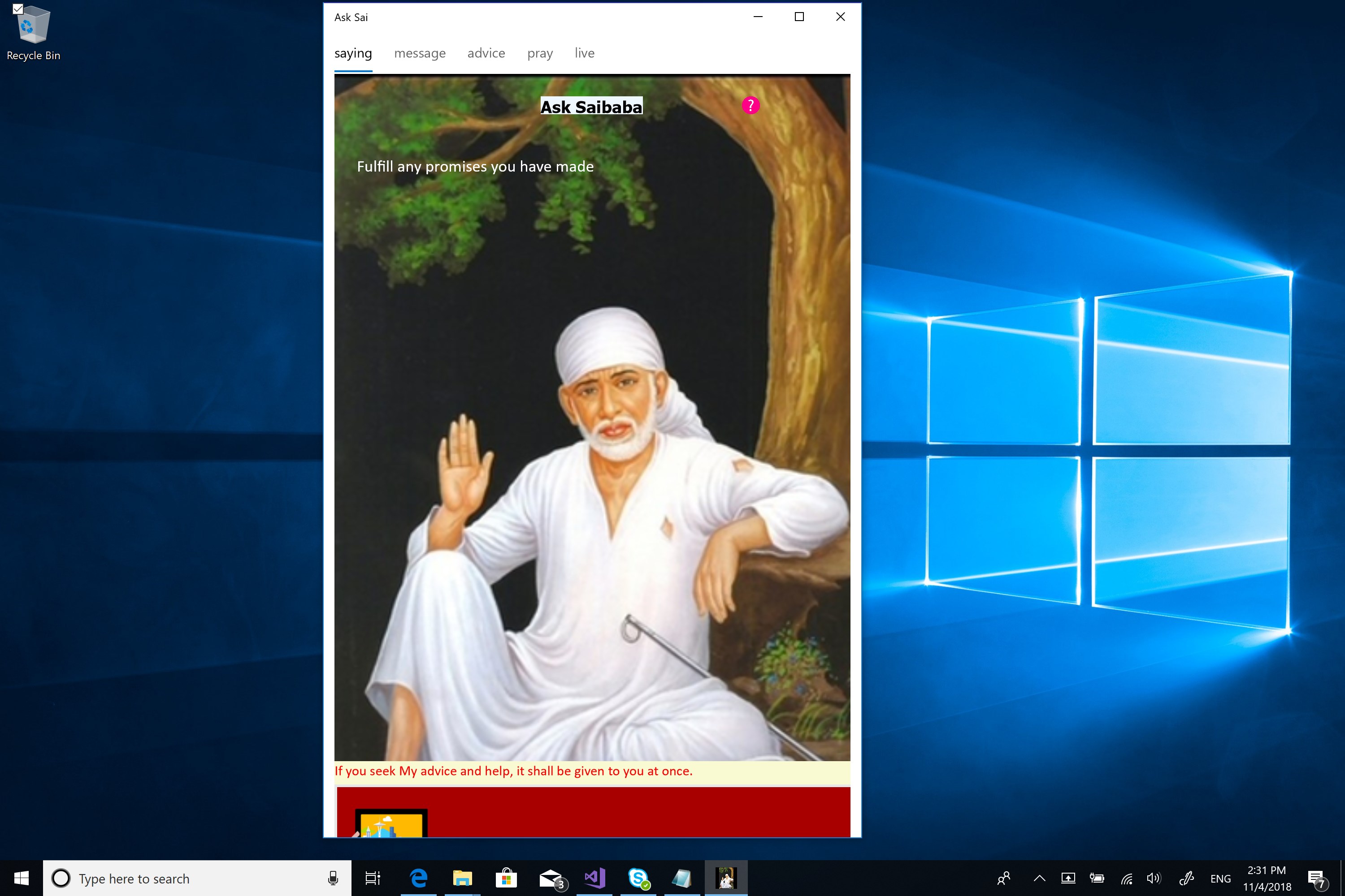 This application facilitates seeking a Sai-Saying from Sai leelas, or a Sai-Message from Sri Madhav Lele's book. Pondering on that message answers the question in mind. One can see Sri Sai Baba's advice on any specific issue by submitting simple options such as YES, NO or whatever is appropriate for the question. Think of Baba and plead for the advice mentally before asking. This application is built with pure devotion to Baba and with His blessings. The accuracy of the results however depends on one's faith towards Sai Baba.