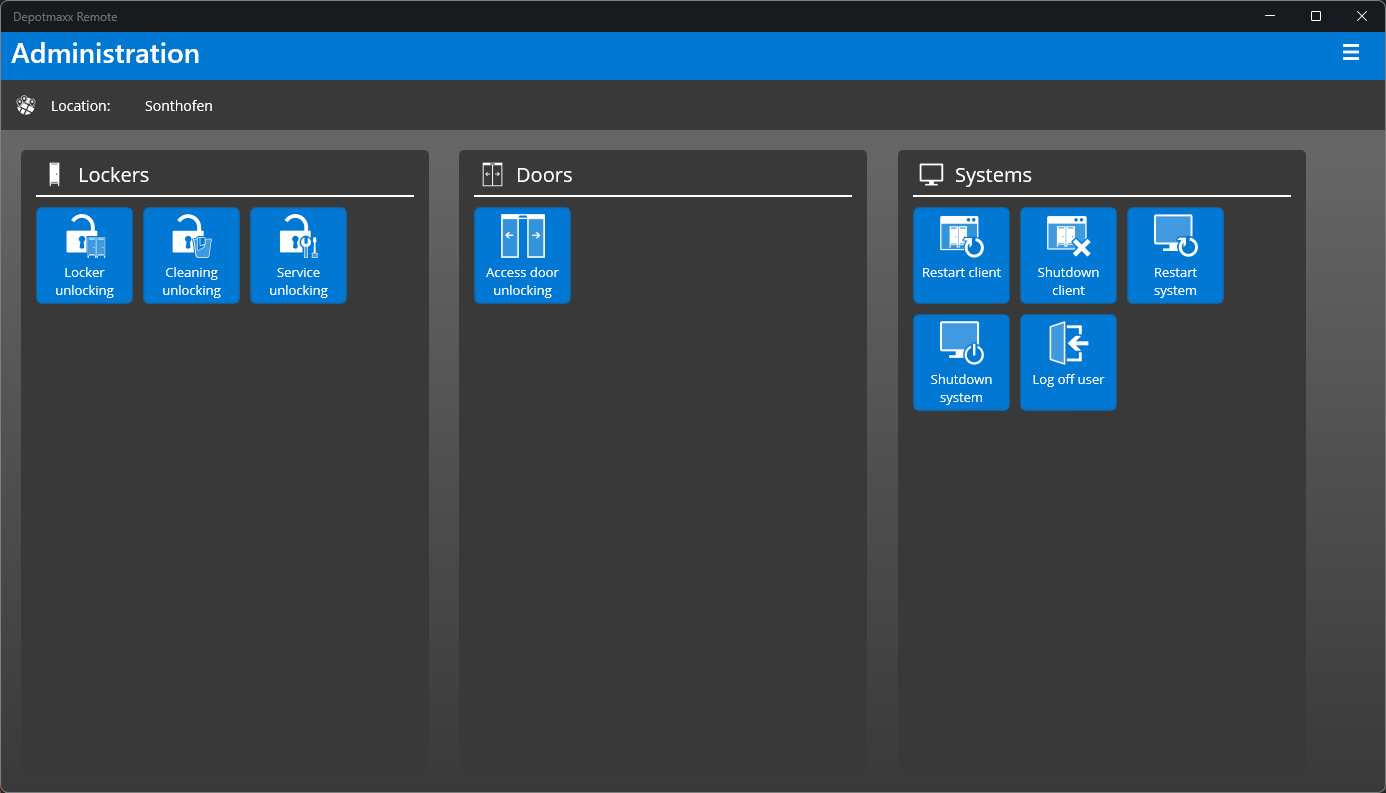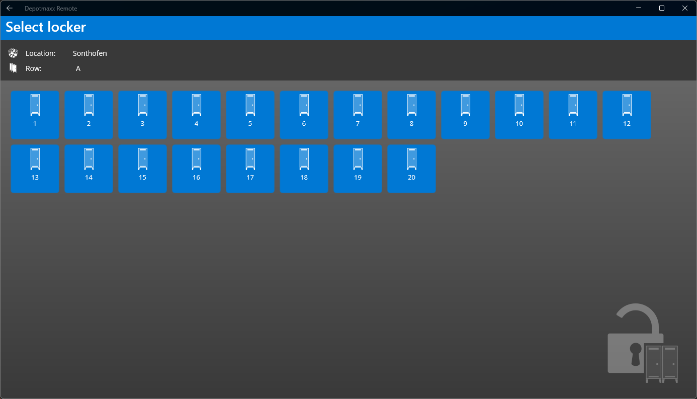 Manage Depotmaxx anywhere in your ski depot and rental shopUnlock specific locker doorsConduct cleaning unlockingConduct service unlockingUnlock automatic access doors to the depot areaSystem functions for Depotmaxx client restart and shutdown