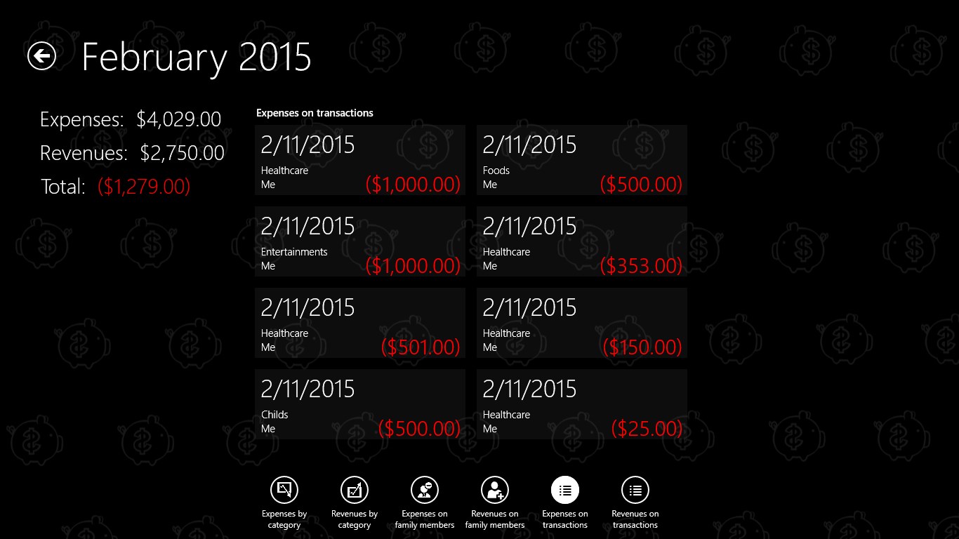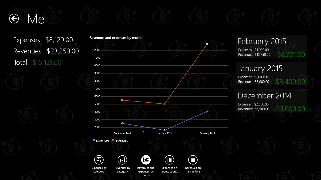 You can track overall income and expenses of current month by category.You can track overall income and expences of any family member by category.You can track overall income and expences for any month by family members and by category.Enter the password and the keyword to join your family, save your data in the cloud and restore it in case of device loss or replacement.Adding new income and expence categories is extremely easy.