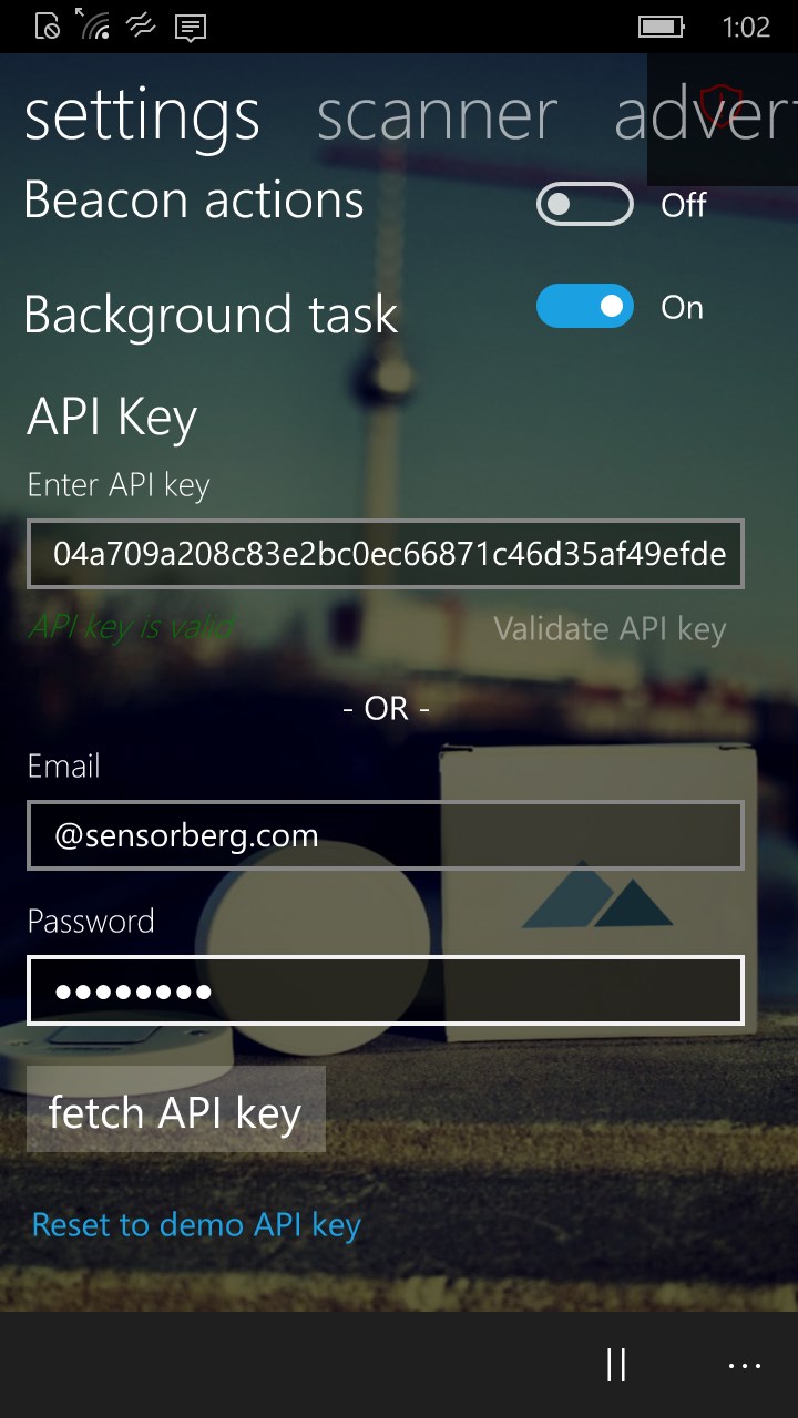 All you need to do is enter your API Key to connect to your Sensorberg account. The app will then receive all previously configured notifications for your Sensorberg Beacon devices whenever you enter their broadcast radius.