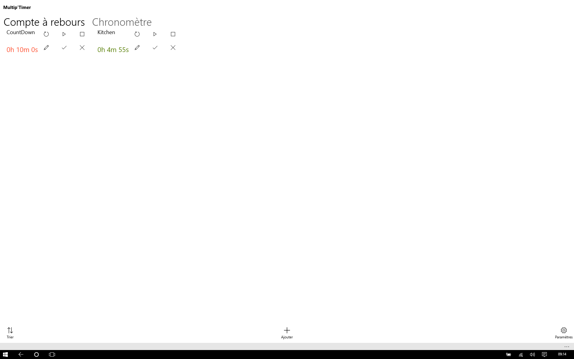 Management of multiple timersManagement of several countdownCountdown remaining time or alphabetically sortedNotification at the end of a countdownDisplay on the icon of the application of the number of countdown and active timersSetting up notifications