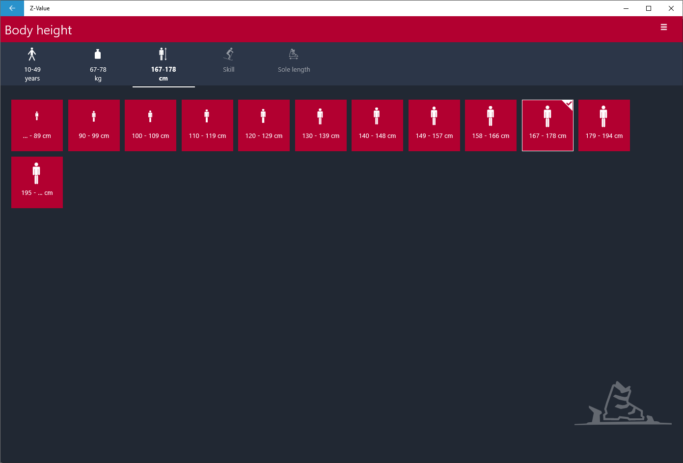 Calculation of the initial setting value (Z-Value, DIN setting) for a ski binding using the weight method (ISO 11088). Body height can be input in centimeters or feet. Body weight can be input in kilograms, pounds, or stones.