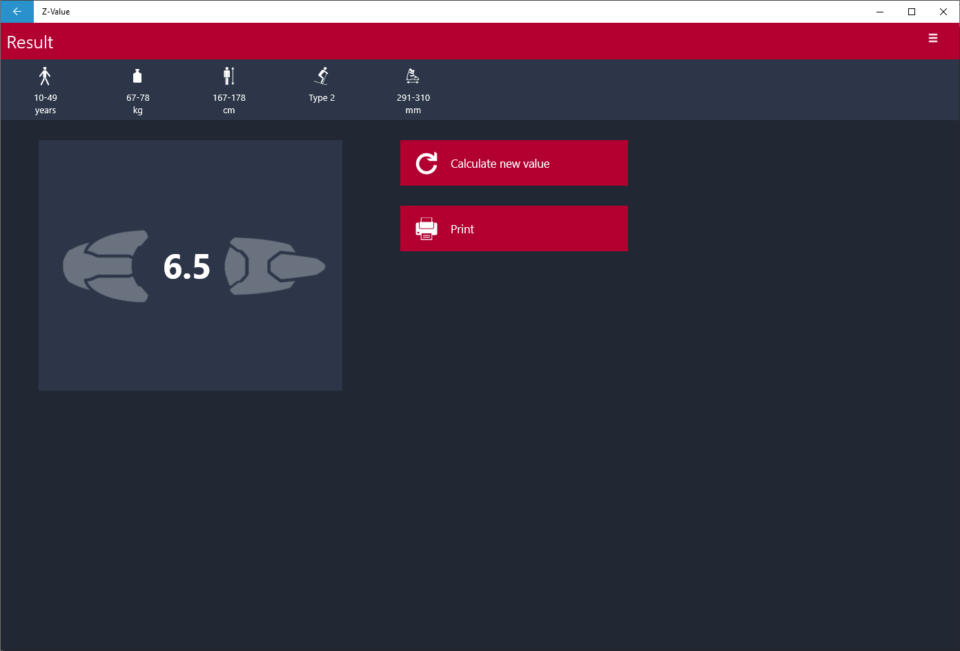 The calculated Z-Value (DIN Setting) is only an initial setting value for the binding adjustment. The correct setting of ski bindings can only guaranteed with proper testing using a binding inspection device.