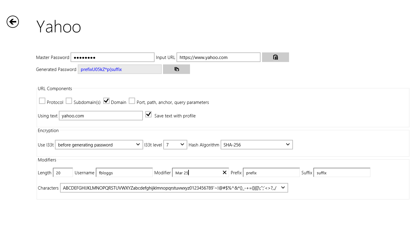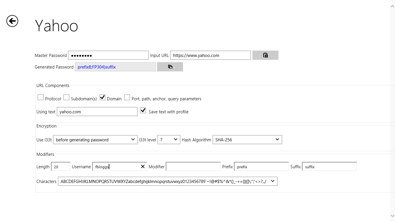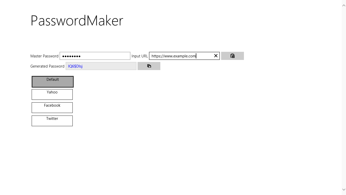 You provide PasswordMaker two pieces of information: a "master password" -- that one, single password you like -- and the URL of the website requiring a password. Through the magic of one-way hash algorithms, PasswordMaker calculates a message digest, also known as a digital fingerprint, which can be used as your password for the website. Although one-way hash algorithms have a number of interesting characteristics, the one capitalized by PasswordMaker is that the resulting fingerprint (password) does "not reveal anything about the input that was used to generate it." In other words, if someone has one or more of your generated passwords, it is computationally infeasible for him to derive your master password or to calculate your other passwords.