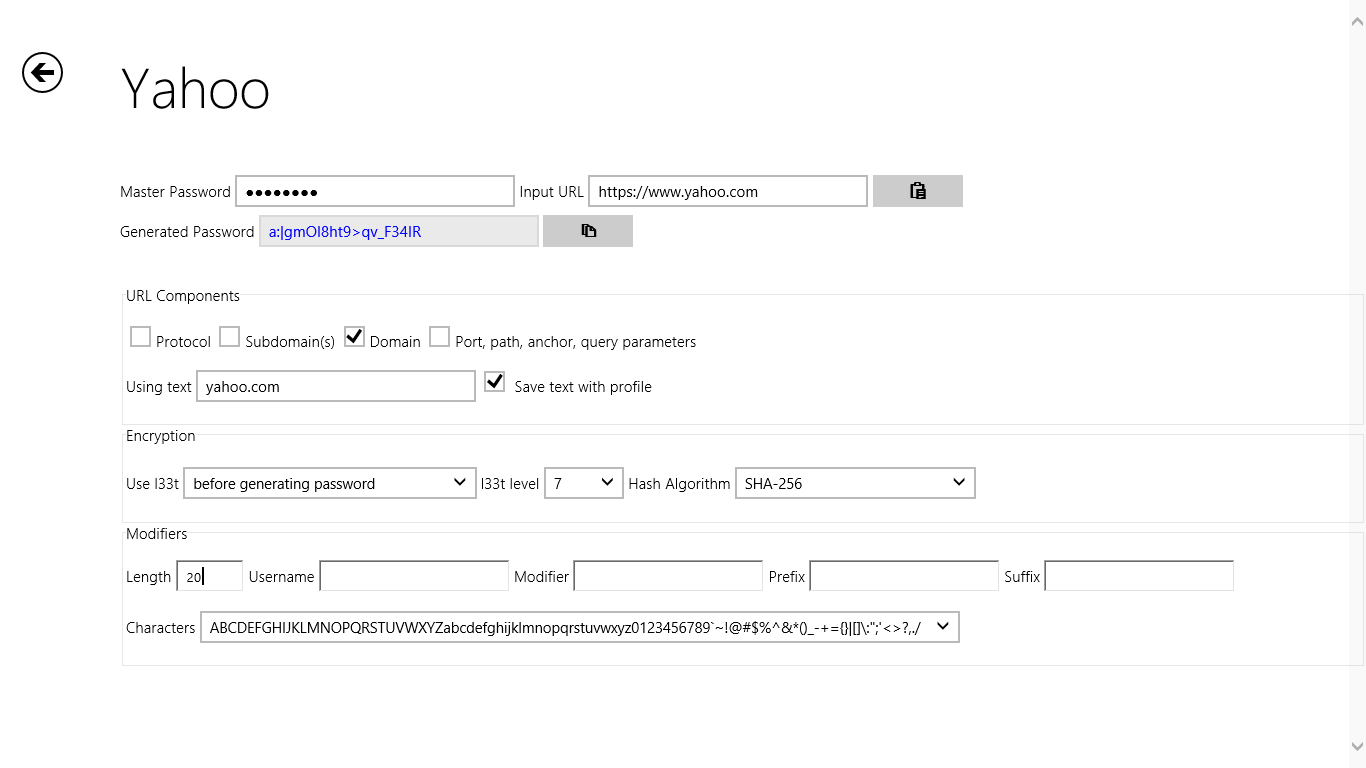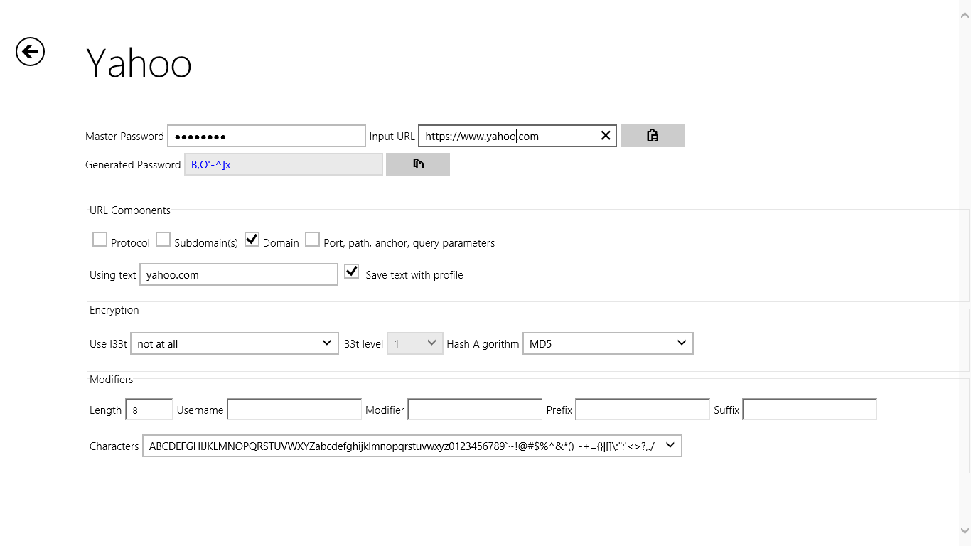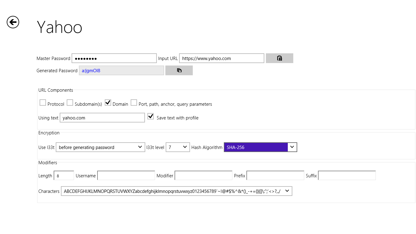 You provide PasswordMaker two pieces of information: a "master password" -- that one, single password you like -- and the URL of the website requiring a password. Through the magic of one-way hash algorithms, PasswordMaker calculates a message digest, also known as a digital fingerprint, which can be used as your password for the website. Although one-way hash algorithms have a number of interesting characteristics, the one capitalized by PasswordMaker is that the resulting fingerprint (password) does "not reveal anything about the input that was used to generate it." In other words, if someone has one or more of your generated passwords, it is computationally infeasible for him to derive your master password or to calculate your other passwords.