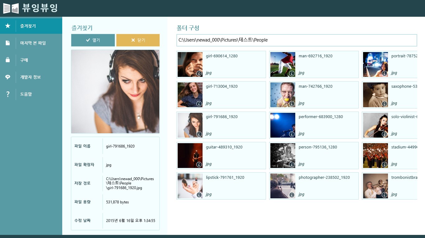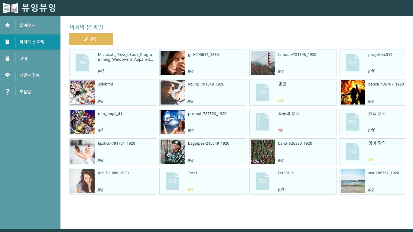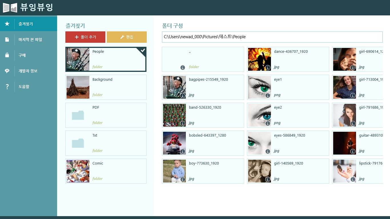 Compressed file support. (zip), Supports multiple compressed files. (zip)Image formats supported. (jpg, png, bmp, ico, tif, gif) / Text formats supported. (TXT) / PDF formats supported. (PDF)Folder Favorites Support. Recent history supported.Go to the next folder or a compressed file support capabilities.Landscape view, portrait view, View one photo, View a half photo, Right view, left view.metadata (EXIF) display.