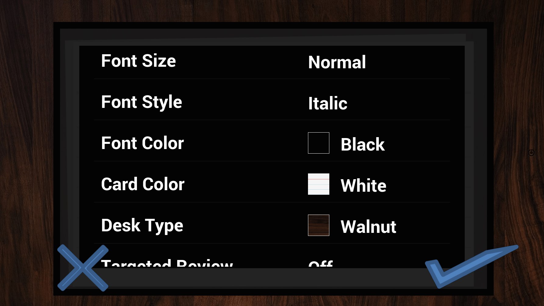 Navigate through flashcards with swipe gestures.Six different index card colors.Three realistic desk backgrounds.Combine different fonts, styles, sizes and colors for legibility.Success rate percentages for every deck and individual flashcard.Backup your decks and sync between devices/platforms.Import CSV/TXT exports from your favorite resources on our website.Supports three different languages: English, EspaƱol and (Simplified) Chinese.