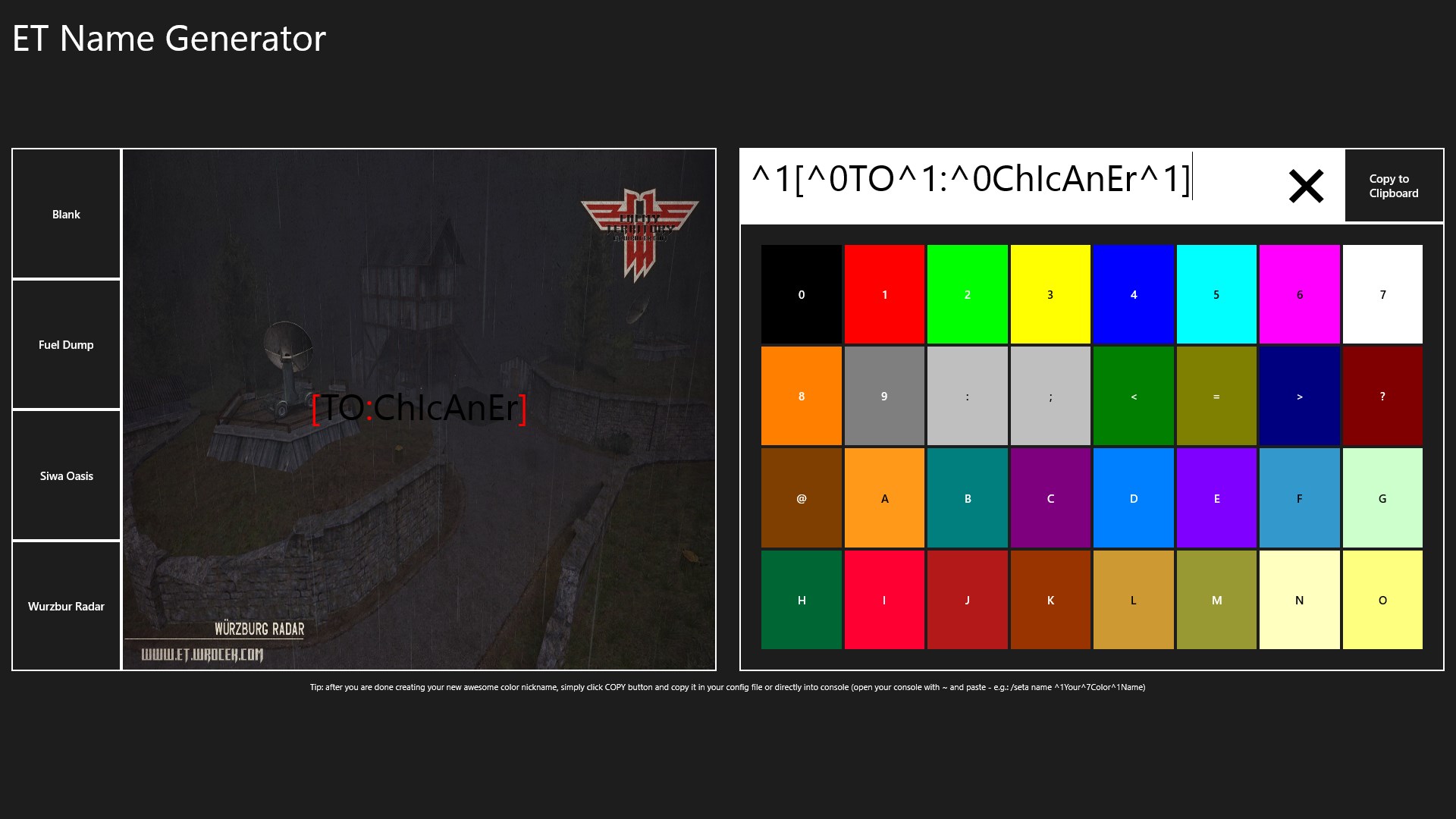 Application simplifies process of creating colourful nicknames in game called Wolfenstein Enemy Territory.
