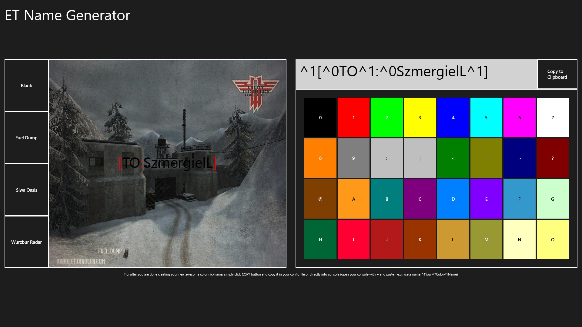 create colourful nick with designerapply in-game name change by copying generated console scriptpreview in-game looks on standard ET maps
