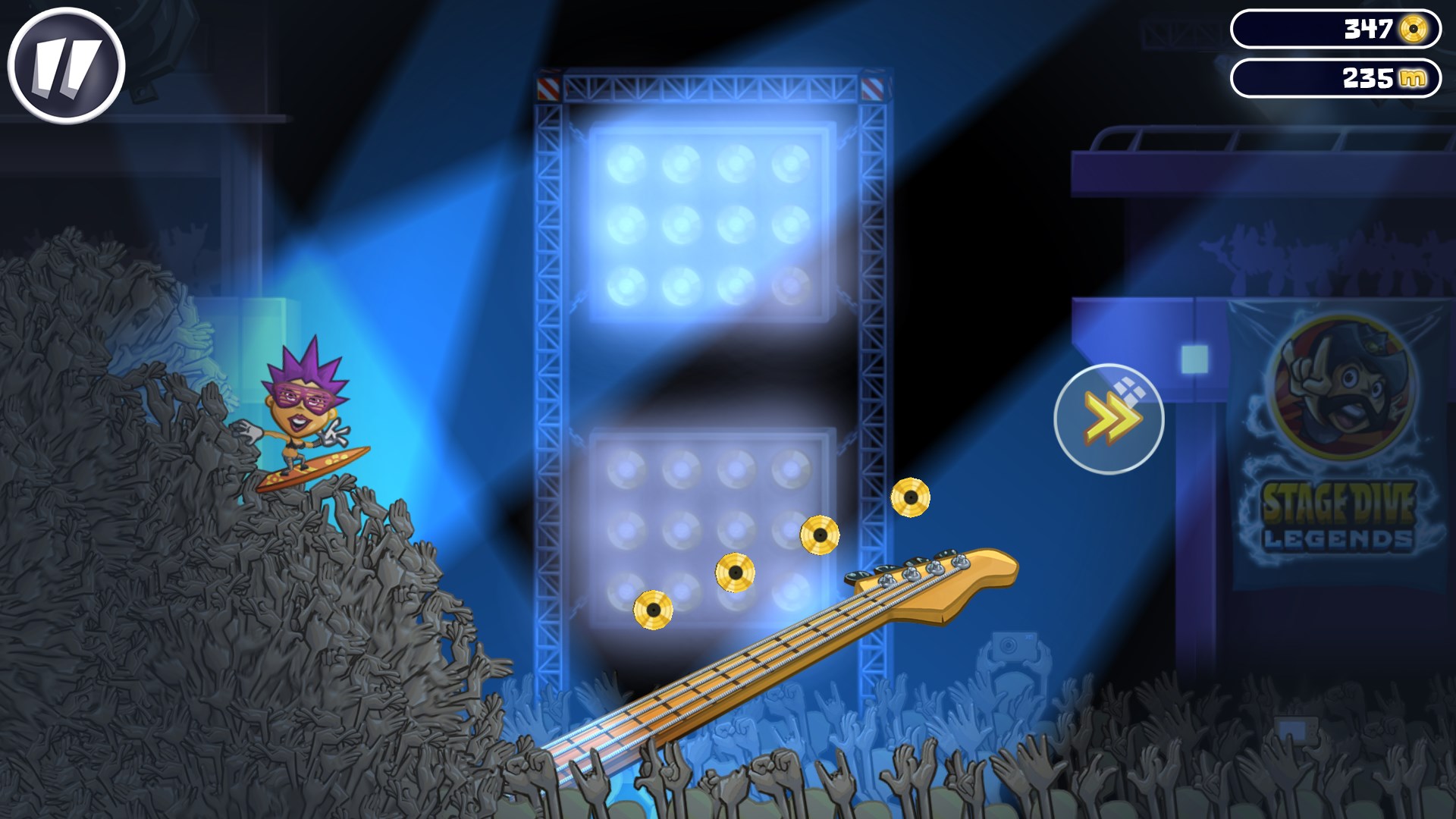 ‘Stage Dive Legends’ is a super-fast runner game with lots of excitement and fun. Play to hard-rocking songs, run backstage, customize your favorite rock star and find the best way to top the records! Explore a vast amount of missions in a race through cities all over the globe. Prove your skills and become a true stage dive legend! Let's rock!