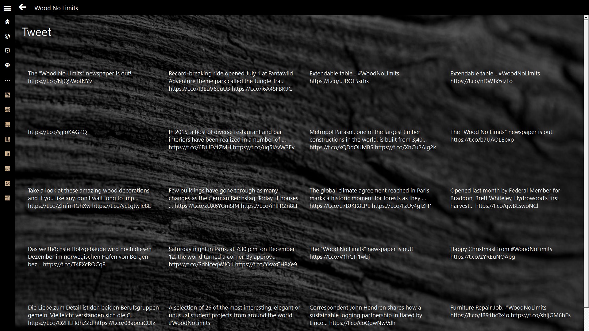 Wood NewsLatest Videos on woodWood News from TwitterWood industry, Architecture, Furniture, Engineering and Science, Arts and Crafts, Design, Forestry, etc.English, Italian, Dutch, French, German