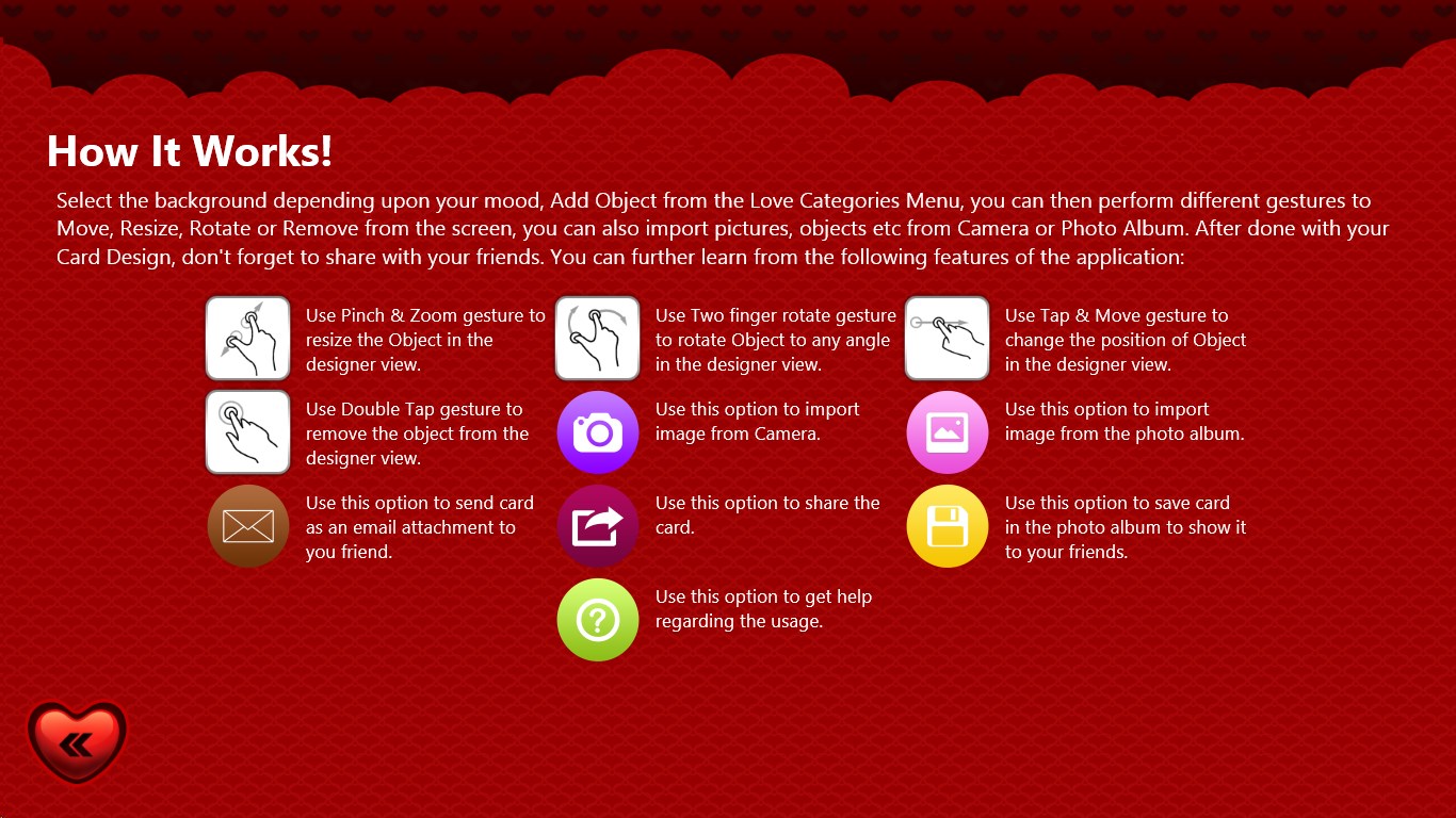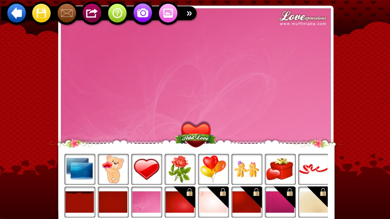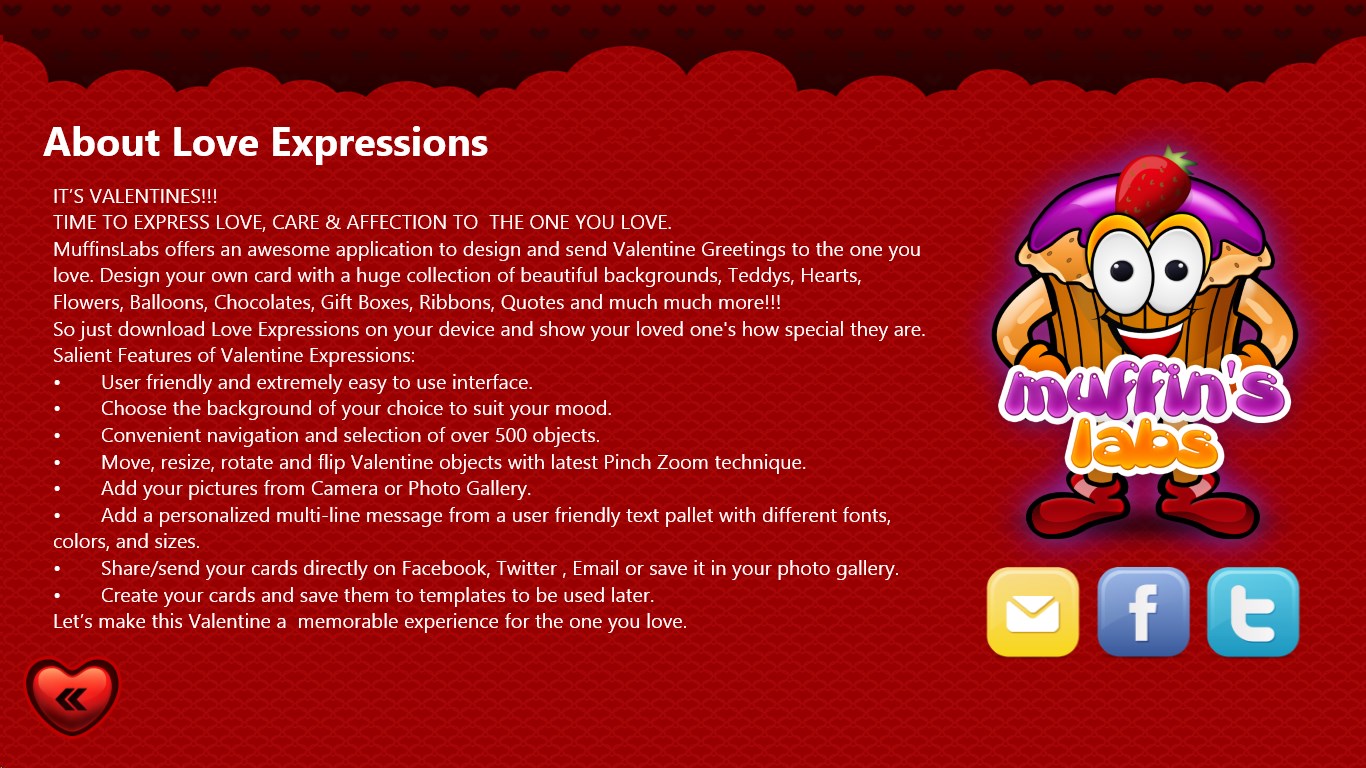 User friendly and extremely easy to use interface.Choose the background of your choice to suit your mood.Convenient navigation and selection of over 500 objects.Move, resize, rotate and flip Valentine objects with latest Pinch Zoom technique.Add your pictures from Camera or Photo Gallery.Share/send your cards directly on Facebook, Twitter , Email or save it in your photo gallery.