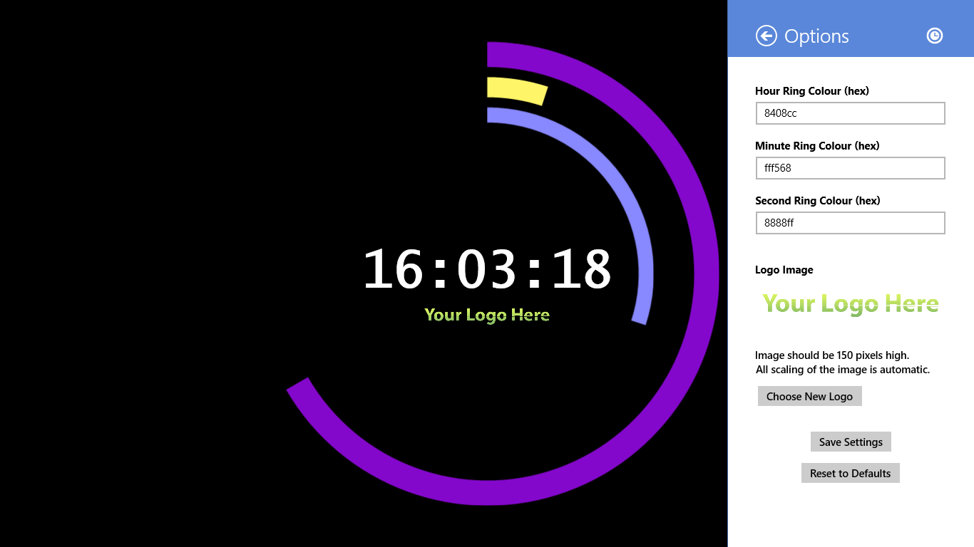 When unlocked you can change the Logo used on the display, from the Dvana logo, to your own. For best results, we recommend a logo 150 pixels high by whatever length you have or need. The app will scale them appropriately if needed. The correct size, will yield the clearest results.
