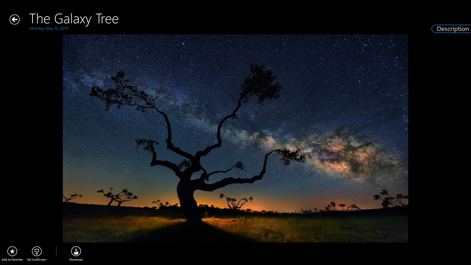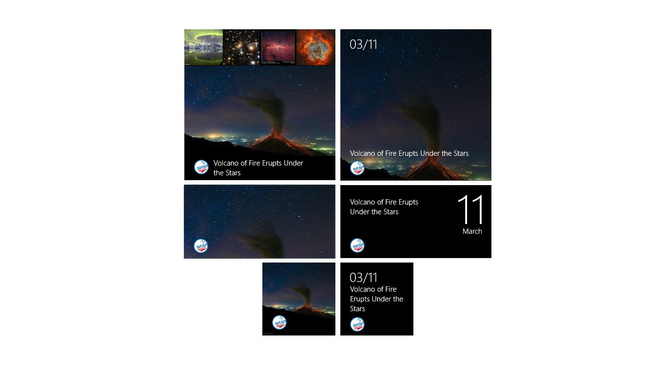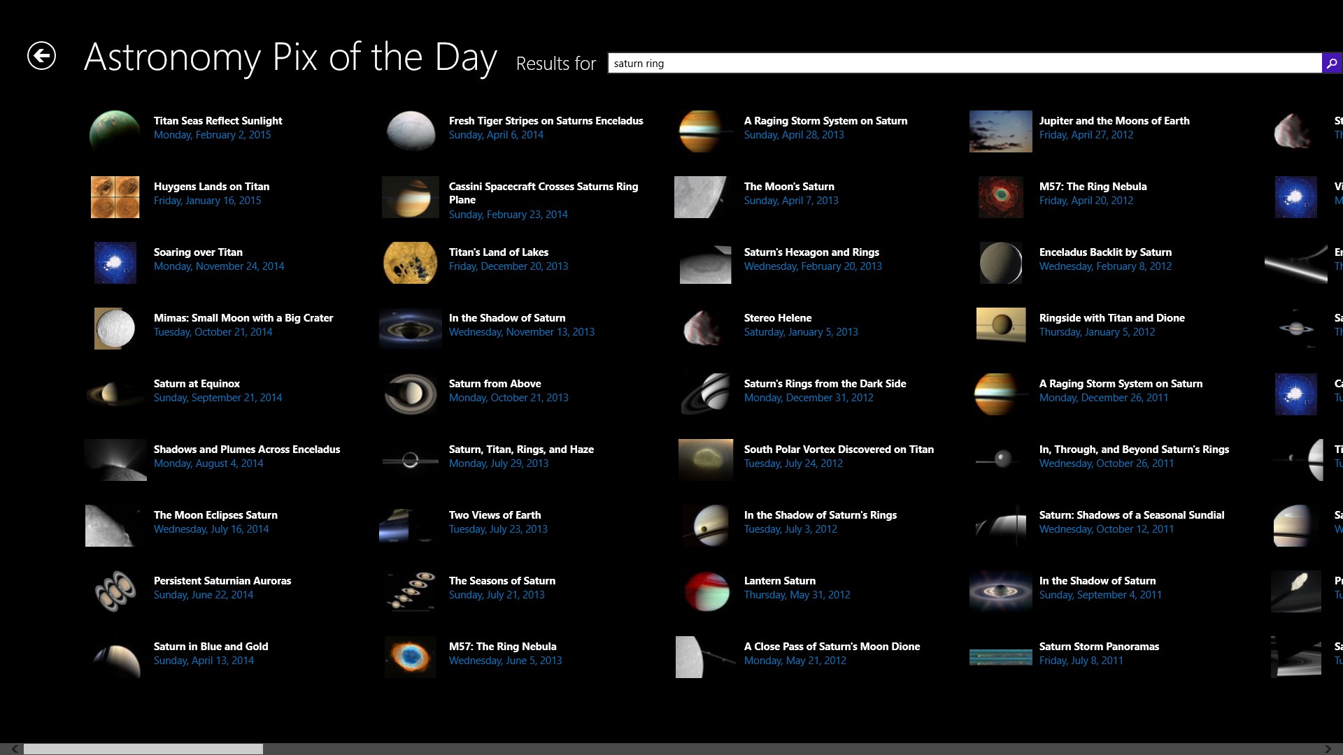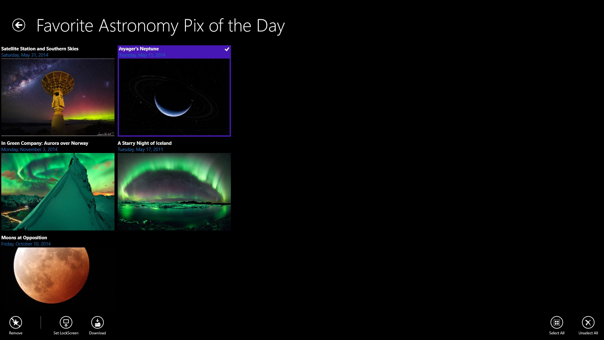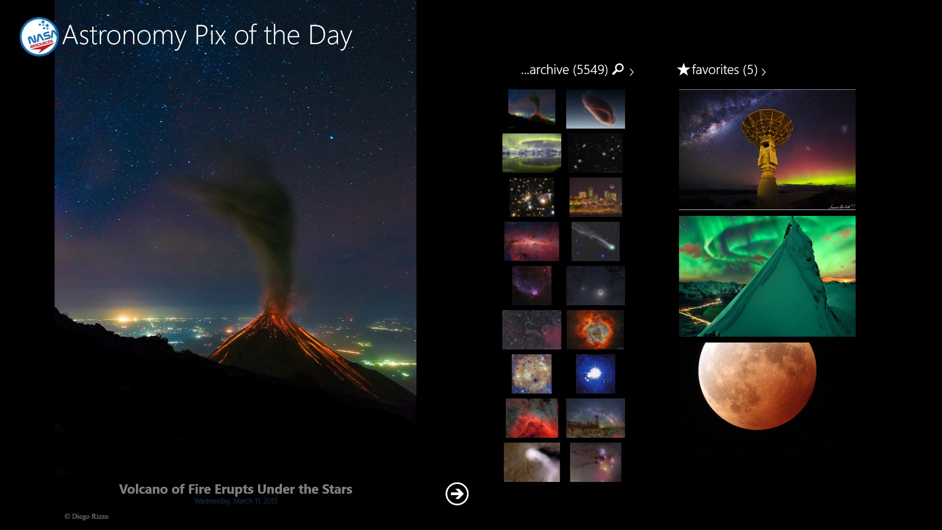 View any picture, video and description from NASA Astronomy Picture of the Day web siteSearch instantaneously in more than 6000 pictures to build your favorite listDownload any picture to your Windows picture libraryChange the Windows lockscreen wallpaper into a space experienceAccess directly the NASA web page of each pictureView the last 5 pictures on the Live Tile of the App