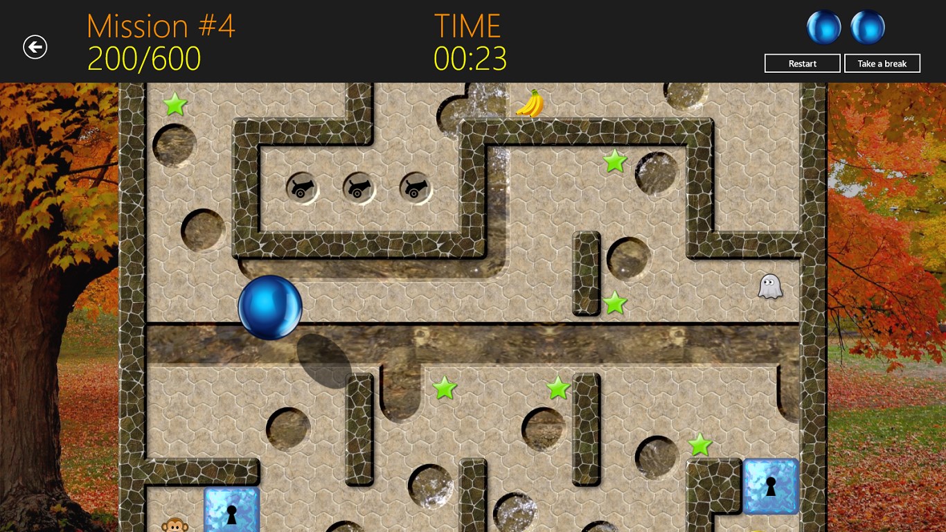 45 beautiful levelsRealistic physicsMany game elements such as holes, traps, cannons, locked doors, keys, hourglasses and ghosts