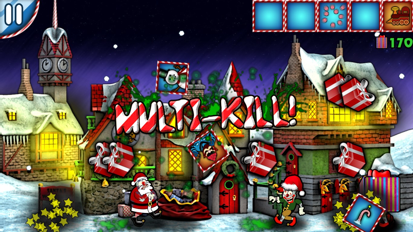 Stellar art and animation.70 progressively difficult missions of addictive physics action. Starts off easy before leading you into over the top action.Bring a friend! Up to 10 point multi-touch support for crazy ragdoll tossing action!Survival Mode! How long can you survive against wave after wave of zombie elves?Bonus rounds! Launch giant snowballs and smash invading zombie elves! Unlock more attacks as you progress.14 unique zombie types, each with their own powers, plus 5 big bosses to battle!15 physics based weapons to deal out massive damage to the zombie elf horde! Upgrade them in the Workshop!Epic boss battles!