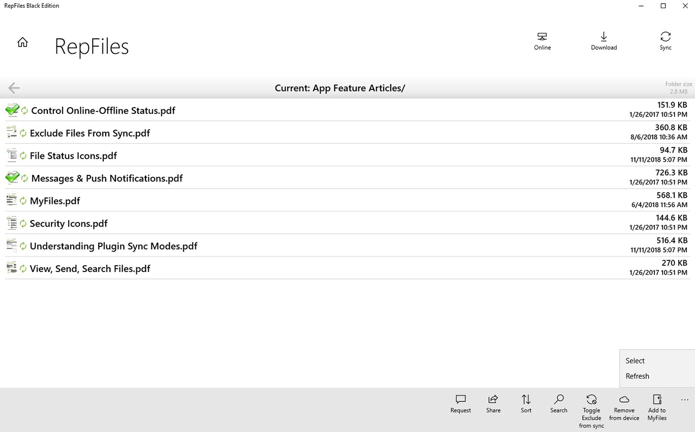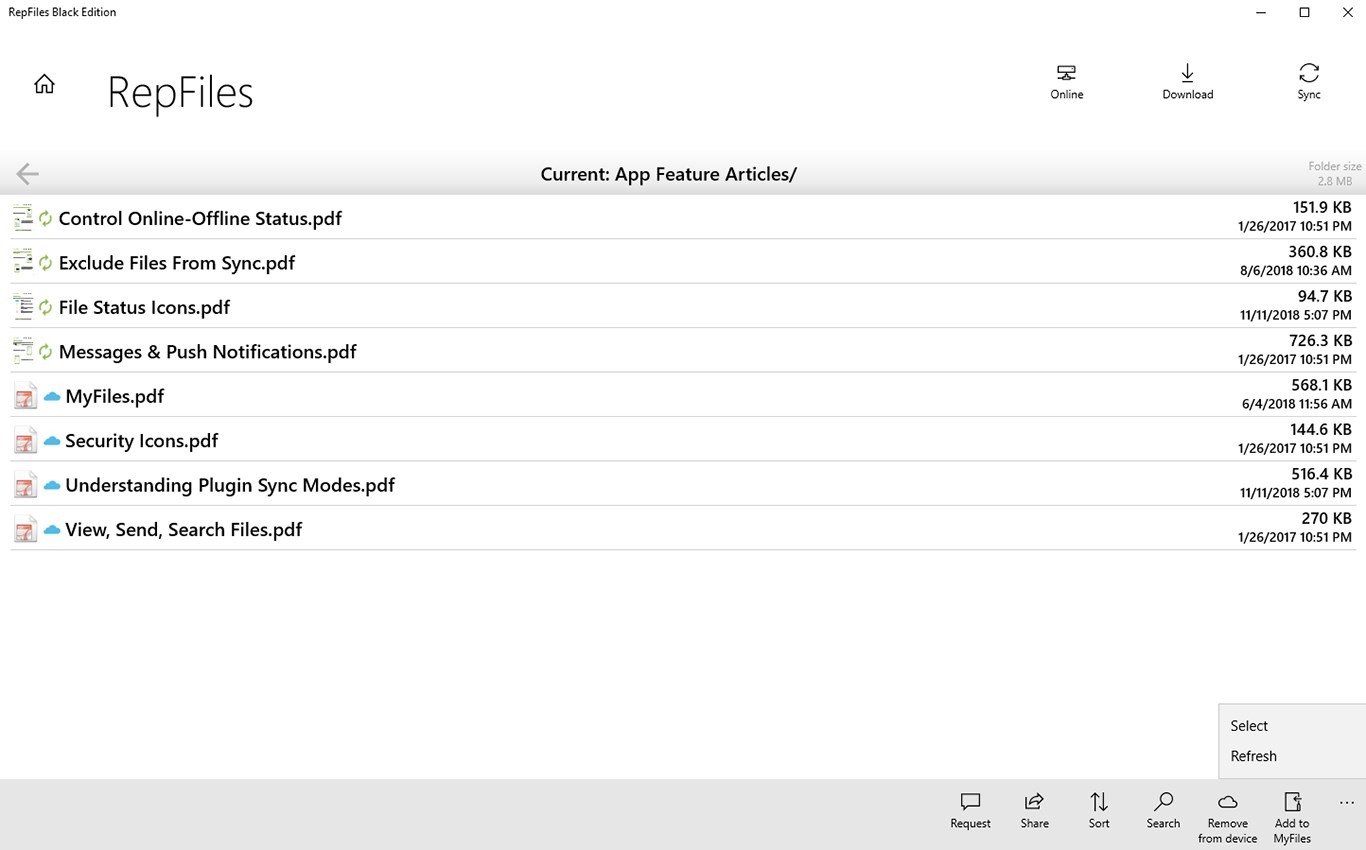 The RepFiles application and end-to-end file distribution system are designed to prepare salespeople with a complete package of the latest sales and marketing materials in one unified location. Content inside this application is managed directly by the companies supplying it, updated with a simple sync and accessible anytime, anywhere - with or without internet connection.