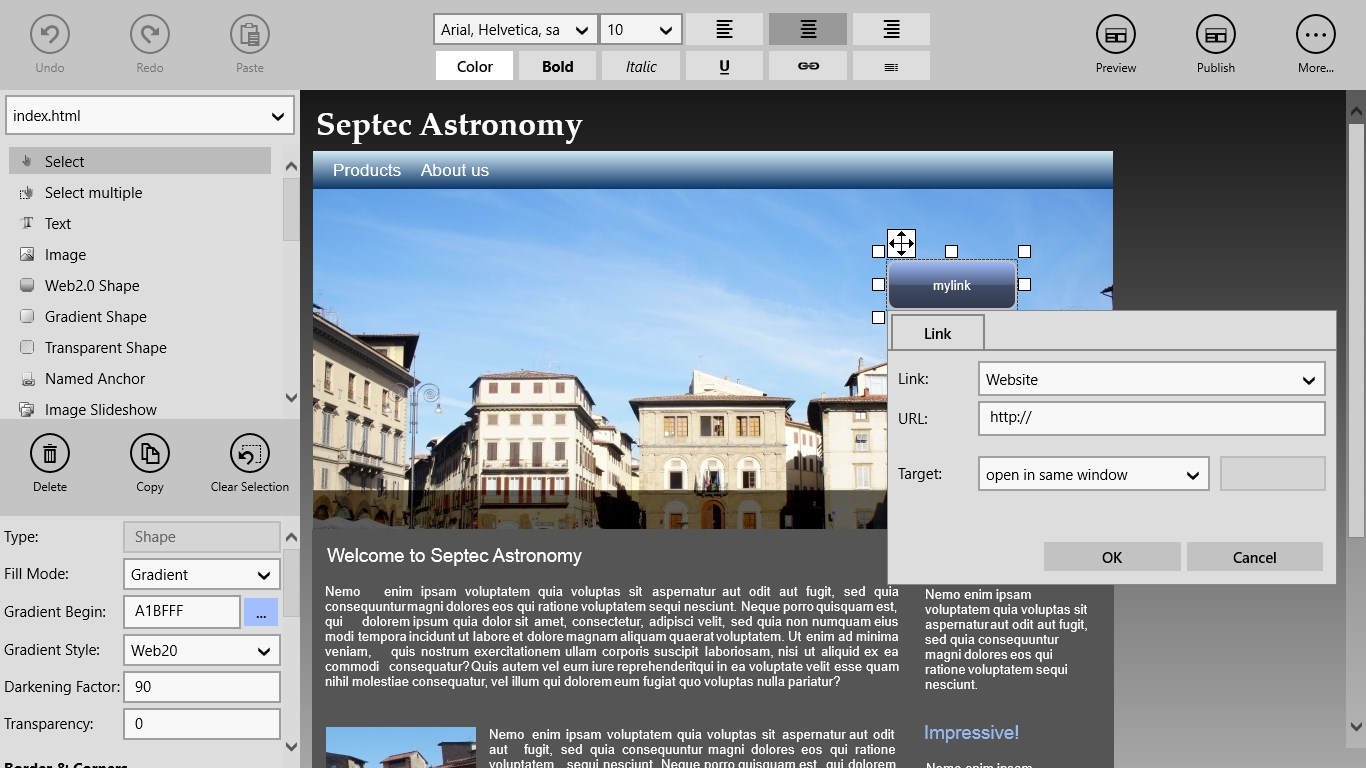 Website Constructor is an editor for creating professional looking Websites, without HTML knowledge and programming. With a few clicks it is possible to create web pages with elements like Web2.0 buttons, gradients, round borders, hover effects, transparencies, continuous text and more.