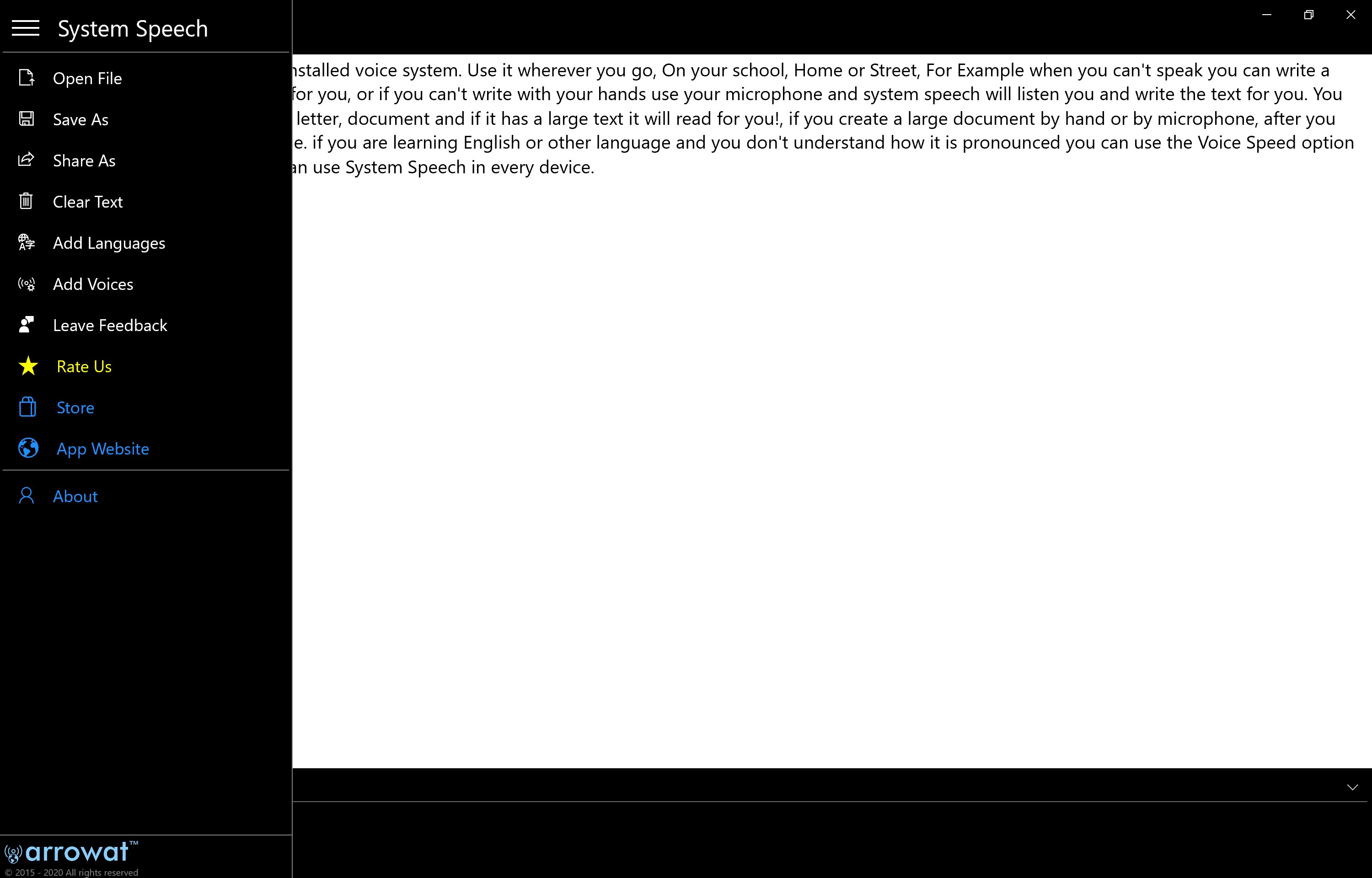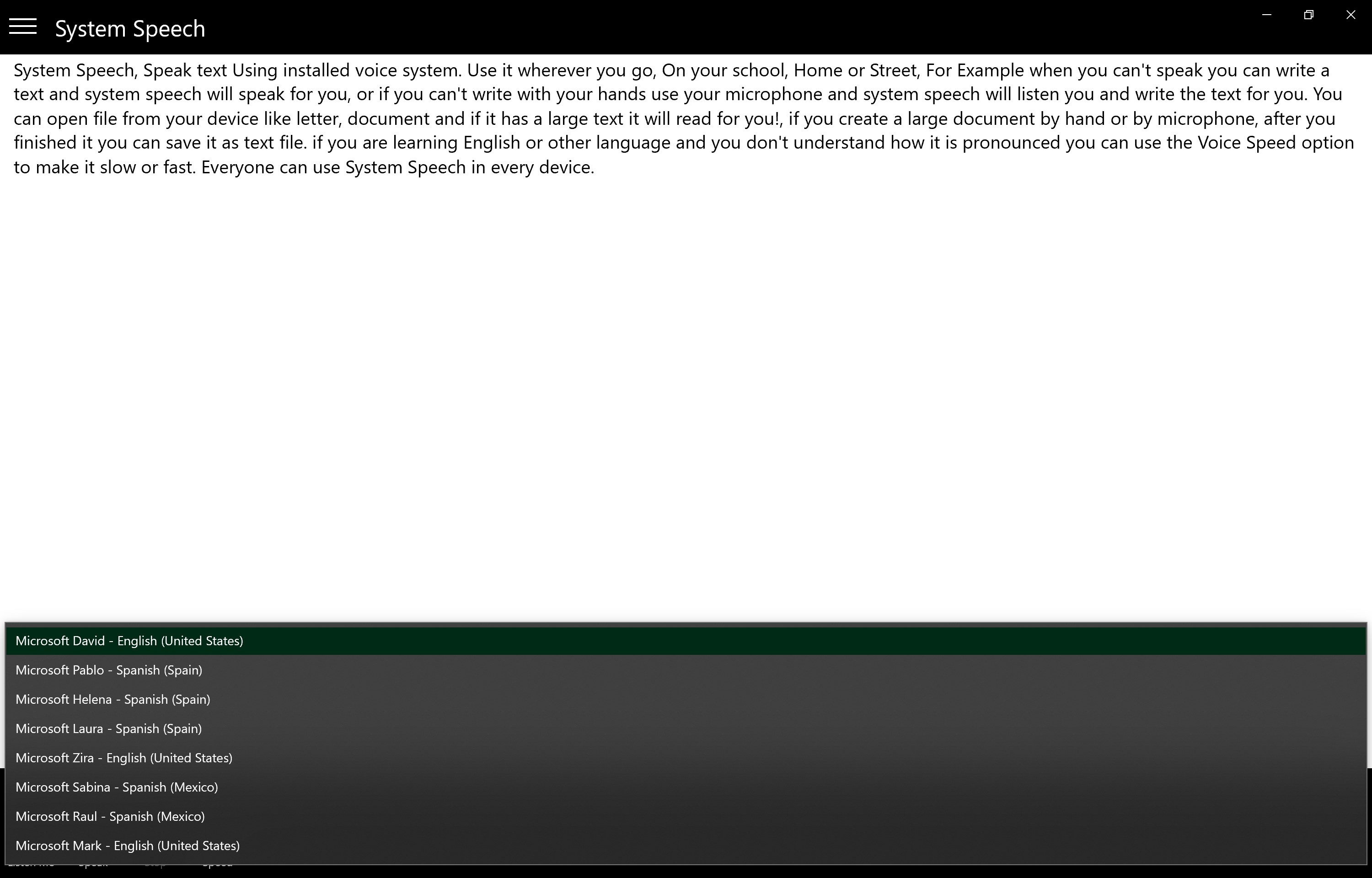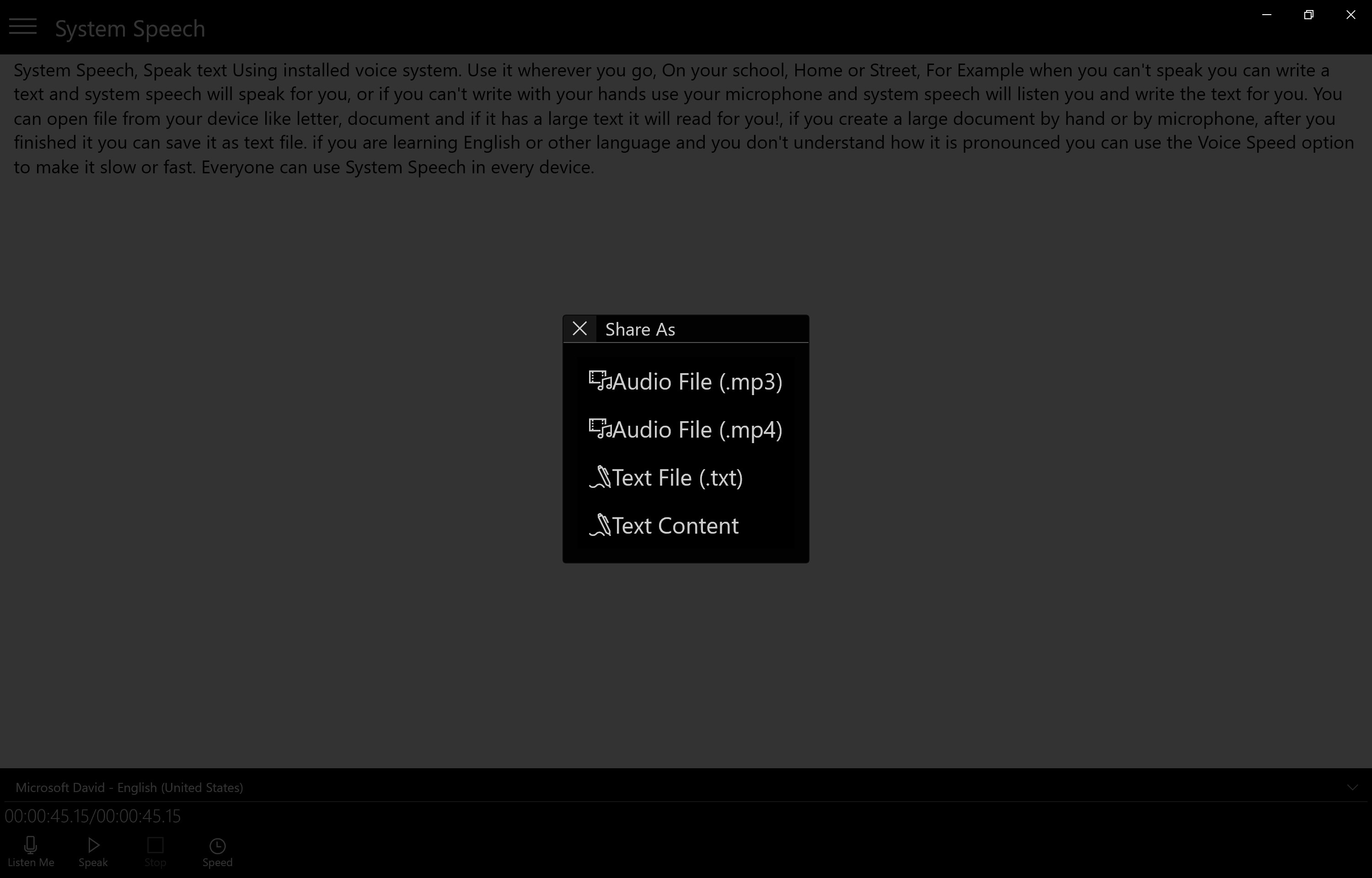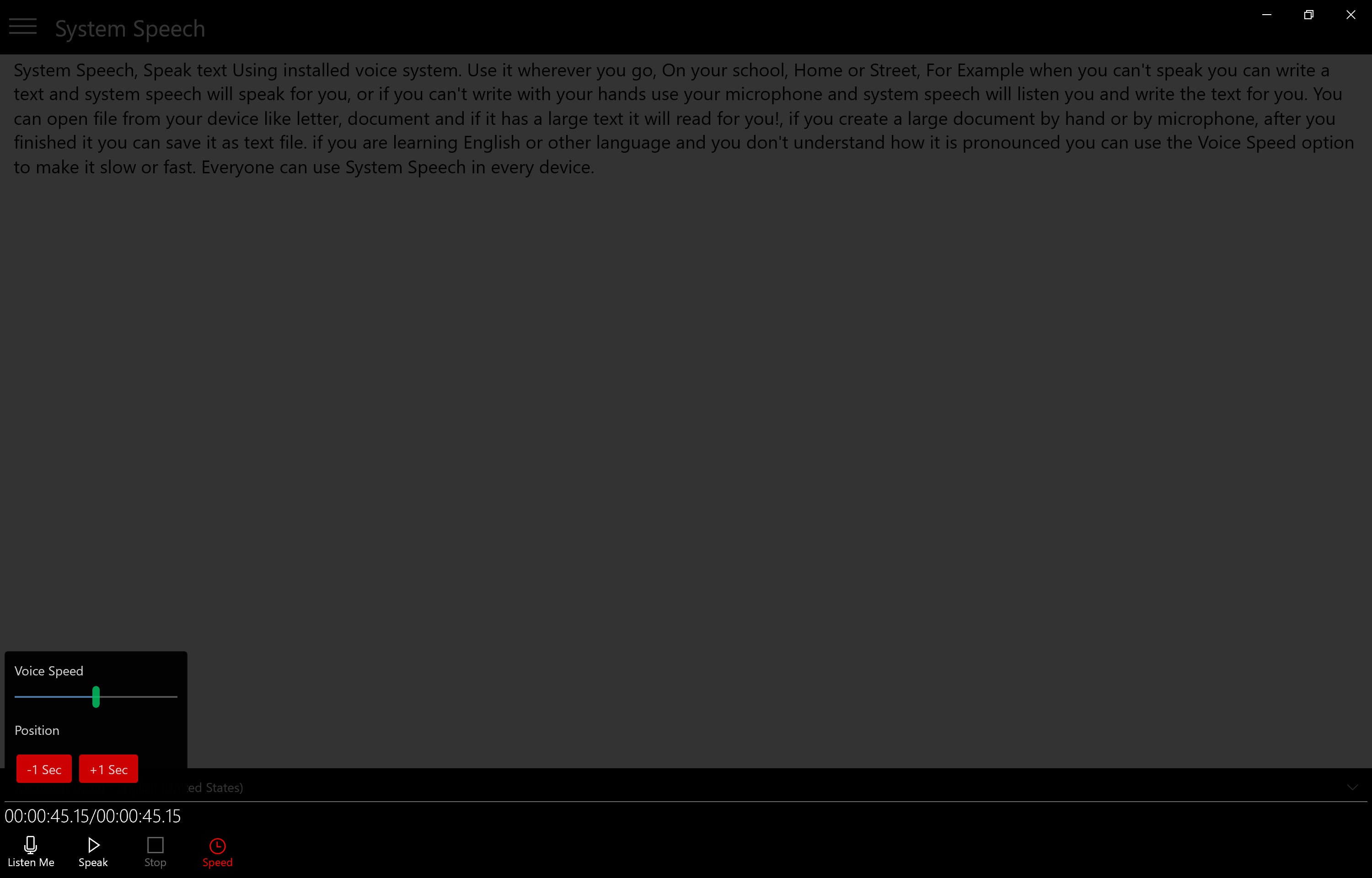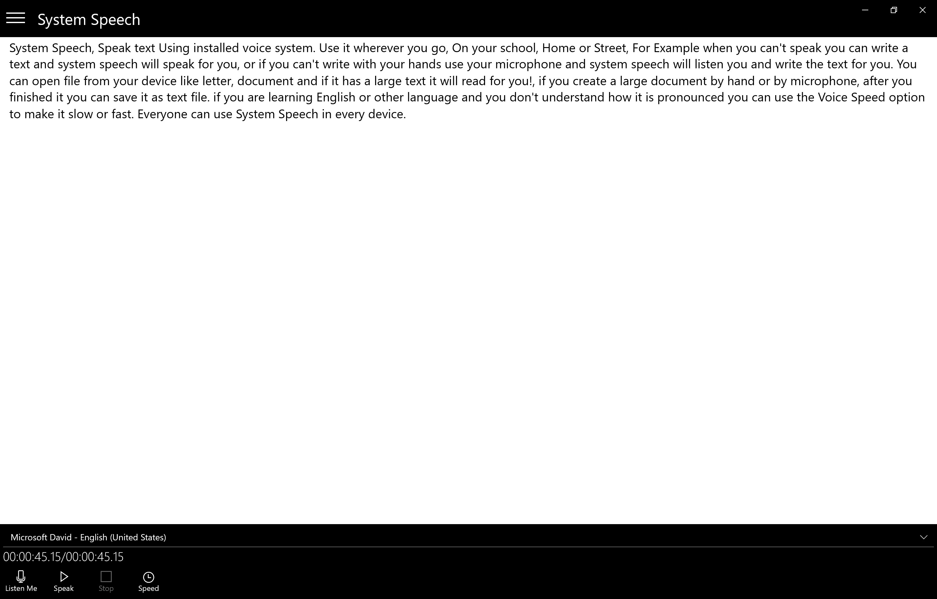 System Speech, speak text using installed voice system, use it wherever you go, on your school, home or street, for example when you can't speak you can write a text and system speech will speak for you, or if you can't write with your hands use your microphone and system speech will listen you and write the text for you. You can open file from your device like letter (.txt), document and if it has a large text it will read for you!, if you create a large document by hand or by microphone, after you finished it you can save it as text file, .MP3, .MP4, .WAV Audio, if you are learning English or other language and you don't understand how it is pronounced you can use the Voice Speed option to make it slow or fast. You can take a picture from the camera to get the text content and let system speech speak it. Everyone can use System Speech in every device.